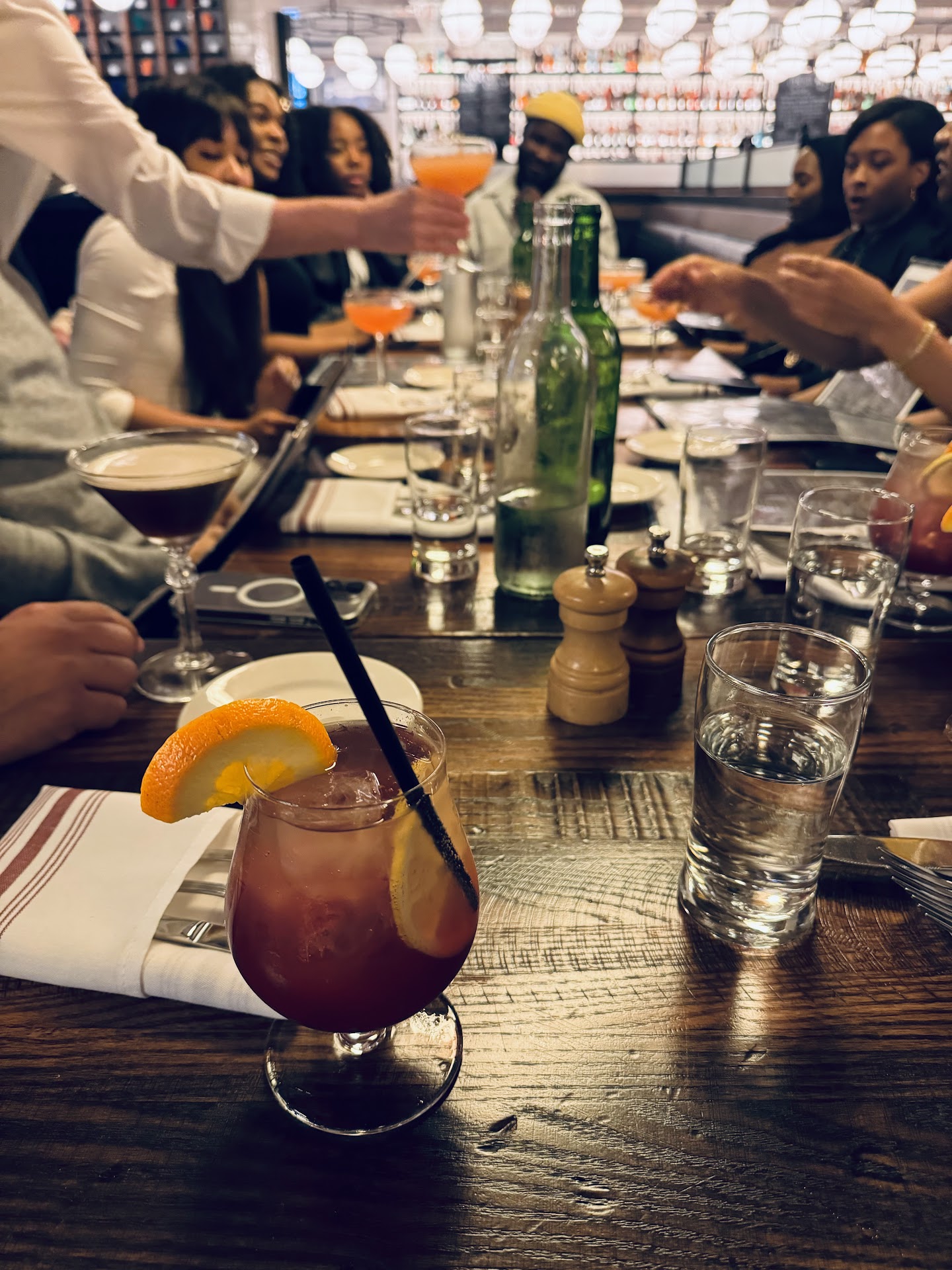 Now let's get into the food chile. So regular brunch included a brunch cocktail WITH your entree (not the whole brunch menu available, but several options to select from!) A GREAT deal considering the à la carte prices would make brunch much more expensive. I had the sangria that came in a good sized coupe. Many of my friends got the pool slushy cocktail which looked real good. 9/10. Then baby the food came out. I got the shrimp and grits... chile 😭😭😭😭 12 out of 10. The grits were so thick and creamy and it was a BAKED EGG up in it. So good. The shrimp were a little overcooked but not too much now. Still good, just not as tender as I would like. I had a bite of the apple french toast, SO good. Probably the second best french toast I've had behind Krasi in Boston. Anyways chile. We got some sides like home fries and sausages, I didn't really try those but they looked ok. I tried a little bit of the Johnny Benedict and I liked it. 9 out of 10. The cheddar jalapeño cornbread was just okay for me. Not bad, I'd eat it again, but it wouldn't be my go to. For our birthday dessert they brought us 1 cookie w a candle in it which I thought was a little underwhelming, and we were charged $4 for the cookie lol. Now, that cookie was damn good mind you, i just thought the presentation was a bit low production. 7 out of 10.