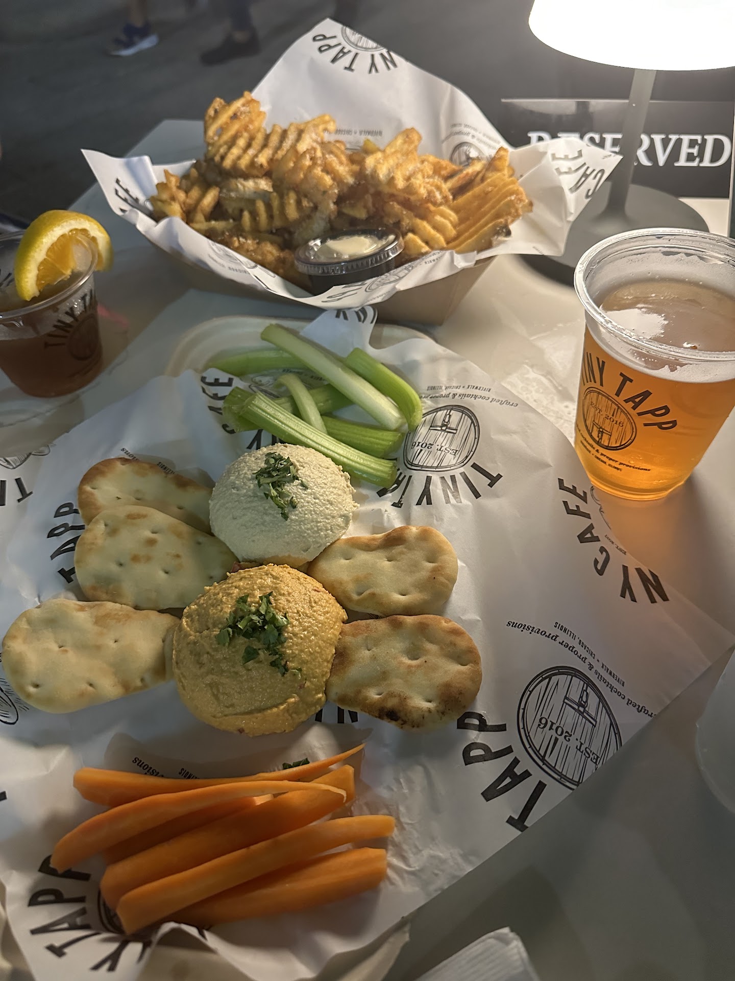 We went looking for a central spot to meet up, hang out, have a drink, and enjoy the river — enter Tiny Tapp. There are tons of tables, both next to the river and a little ways up… but be prepared for a wait. The host was happy to add us to the automated waiting list (30 min estimate and 20 min reality for reference), and we were seated immediately after that.
