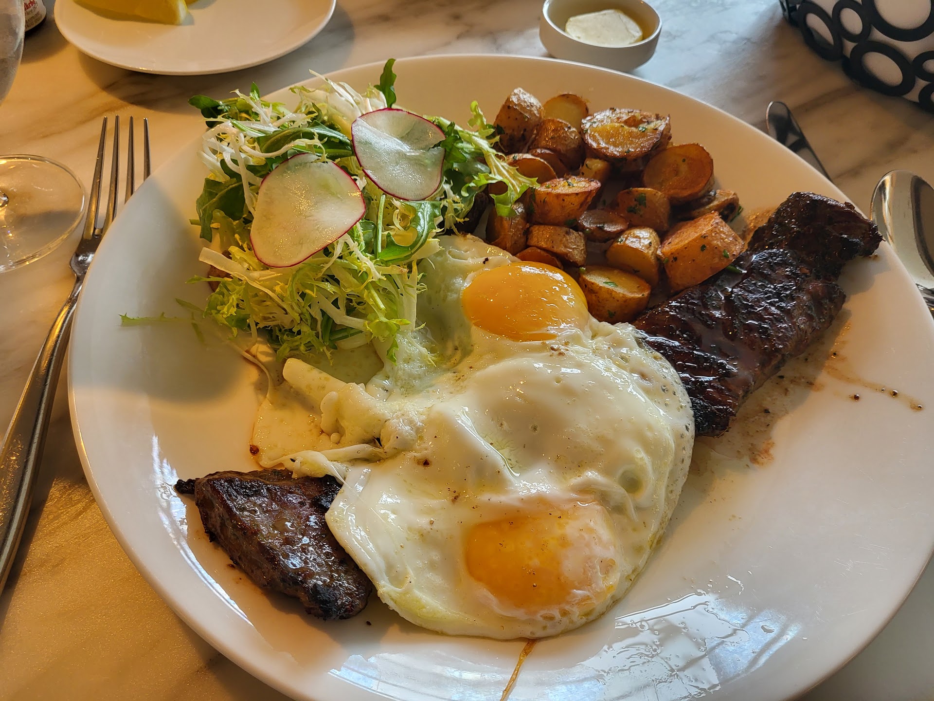 We came here after a day at the Art Museum. We stopped at the bar outside the restaurant before our reservation time. It was relaxing but nice to look around and entertain our eyes. The bat recommended a nice bottle of wine which we had with the free bar snacks. We were able to carry our bottle over to the restaurant to finish it. To start out with the host was very pleasant. The gentleman that greeted us at our table and served us our water was as well. Our waiter was knowledgeable and listened to my husband explaining I was a vegetarian and gave me some suggestions. We had the tomato and burrata for the appetizer. It was good we’ve had better but perhaps to other people this one is better then what we had at other places. You never know. The breads were soooo good. We have been trying to eat more healthy and it was really hard for us to not eat more than one piece each. We split a wedge salad and it was plenty for both of us. I got pasta and my husband got a steak that was cooked to his liking. It’s been a couple of months that we were there so I will try to come back after looking at the menu to remember exactly what the pasta and the sides we had to review them. What is so important to me is how nice...