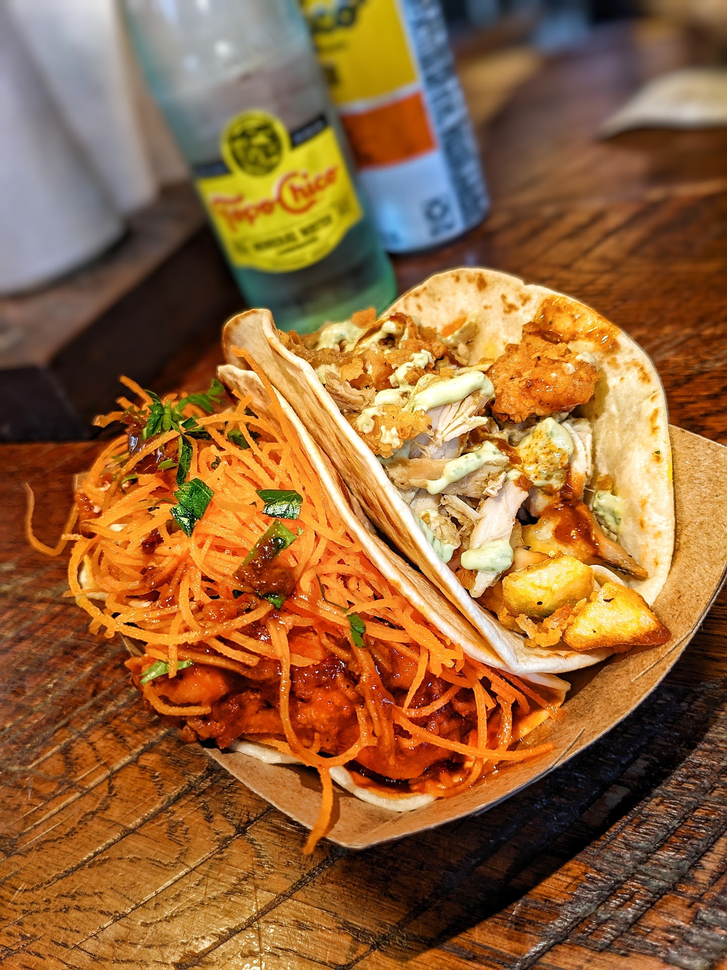 Next came the Buffalo Chicken taco, and it was an absolute winner. It stole the show with its bold flavors and perfect texture balance. The crispy tenders were coated in a tangy, house-made buffalo sauce that provided just the right amount of heat. The sauce clung to the chicken, ensuring every bite was bursting with spicy flavor. Thinly sliced carrots brought a refreshing crunch, while the blue cheese crumbles added a sharp, creamy contrast to the heat. The ranch crema helped mellow out the spice with its cool, smooth texture. Wrapped in a warm flour tortilla, every bite was an explosion of flavor, spicy, creamy, and tangy, all working together in perfect harmony. The buffalo sauce paired with the cool ranch crema and bold blue cheese made this taco an undeniable favorite. The added crunch from the carrots and the crispy tenders elevated the experience to perfection. This taco wasnât just goodâit was crave-worthy, the kind of meal that stays with you long after...