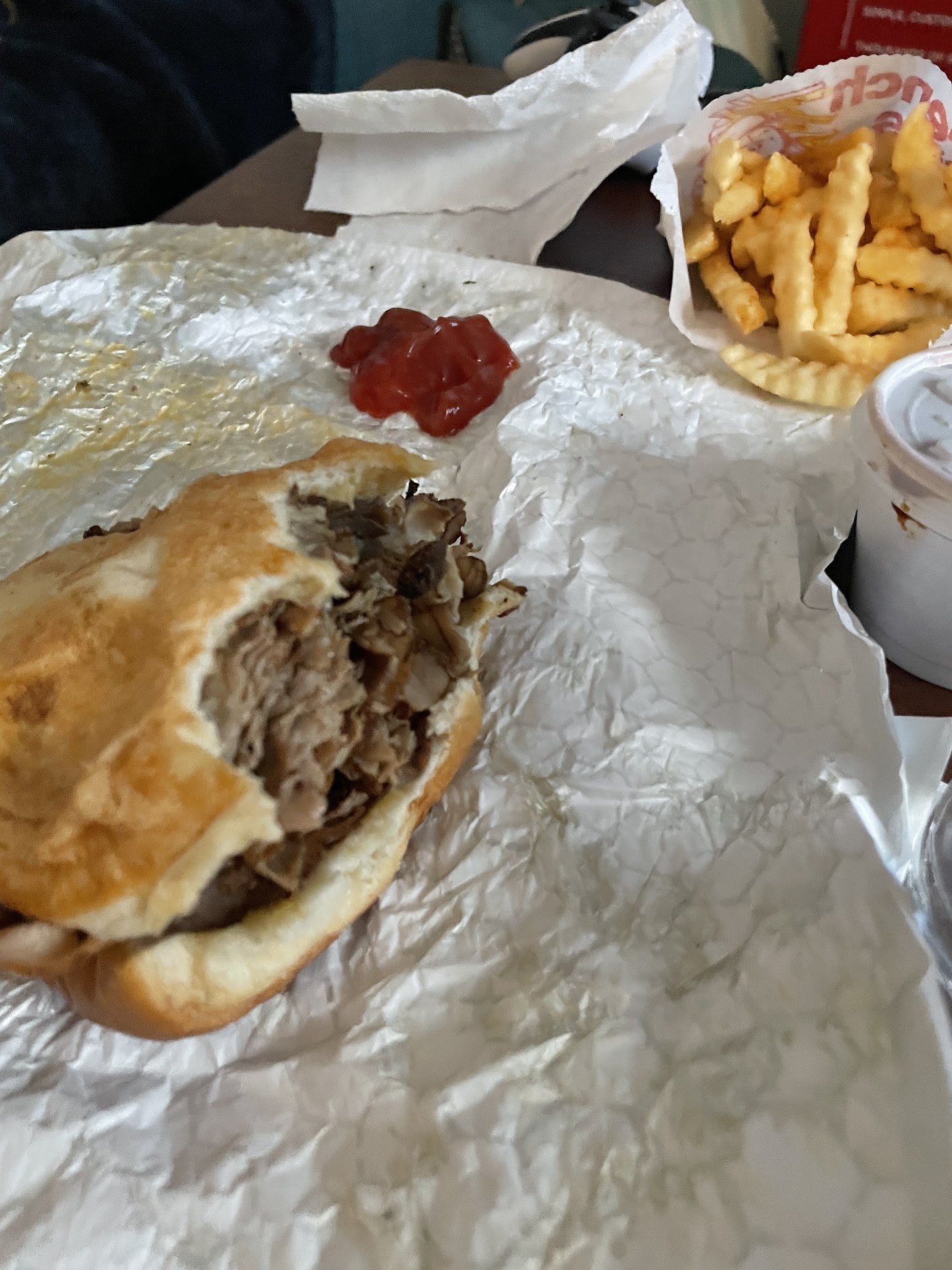 The brisket sandwich is sliced, not chopped. Iāve never had brisket thinly sliced in a sandwich. It was tasty, kinda reminded me of Italian beef meat. You only get one choice of bbq sauce, I ordered mine on the side since I like to control the amount that goes on my sandwich. I was surprised how good the bbq sauce was! The right amount of sweet, smokey and salt. I wouldāve liked it to have a little bit more heat to it. Crinkle cut fries were okay, nothing special.