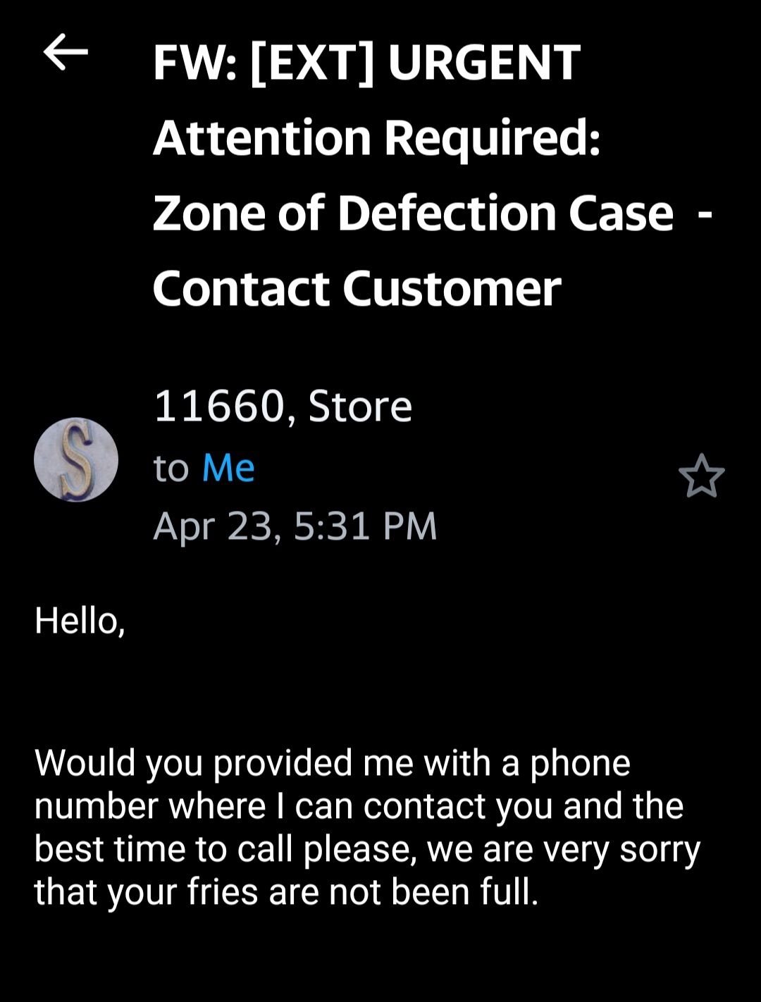 I decided to give them one more try. Because I was in a rush. And yet again from the pictures I've attached you can see it is still the same problem. So I decided to answer the survey on the back of the receipt. I quickly get a reply from the manager asking me for my contact information and tells me he's sorry my fries are not full. I also noticed in the email I'm attached from corporate that they told him to contact me and resolve this matter and for him before closing out this issue to make sure to fix the problem. But it's been 2 months and he hasn't contacted me. Which only goes towards other reviews mentioning on this page of the bad customer service. As you can see from the attached pictures the fries and the sodas are definitely nowhere near full and you do not get what you paid for. If I can give this zero Stars I would. I saved the money by going someplace else even though it cost me more money in gas to drive far away. If I'm in a rush I definitely steer away from here and go to McDonald's or anything else nearby. Because you always get something less than what you paid for. I'm going to assume that he closed out the issue with corporate saying that it resolved the matter and probably didn't bother.