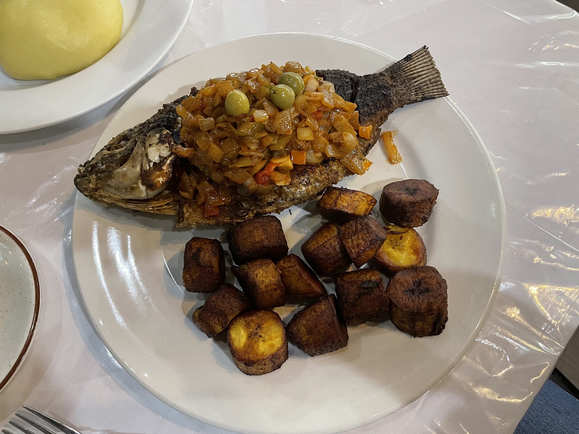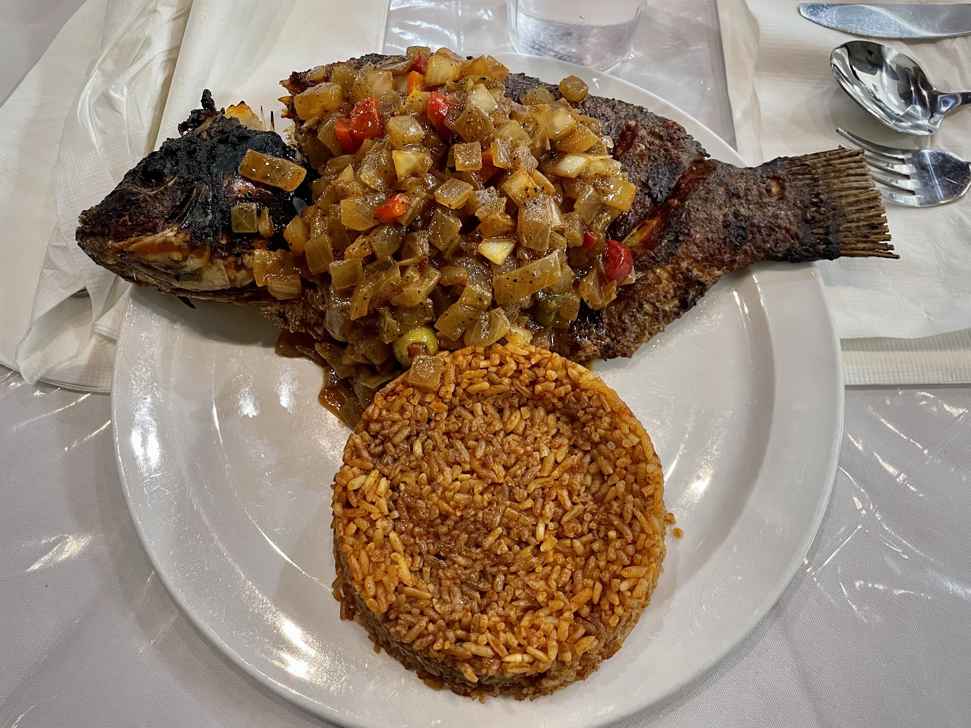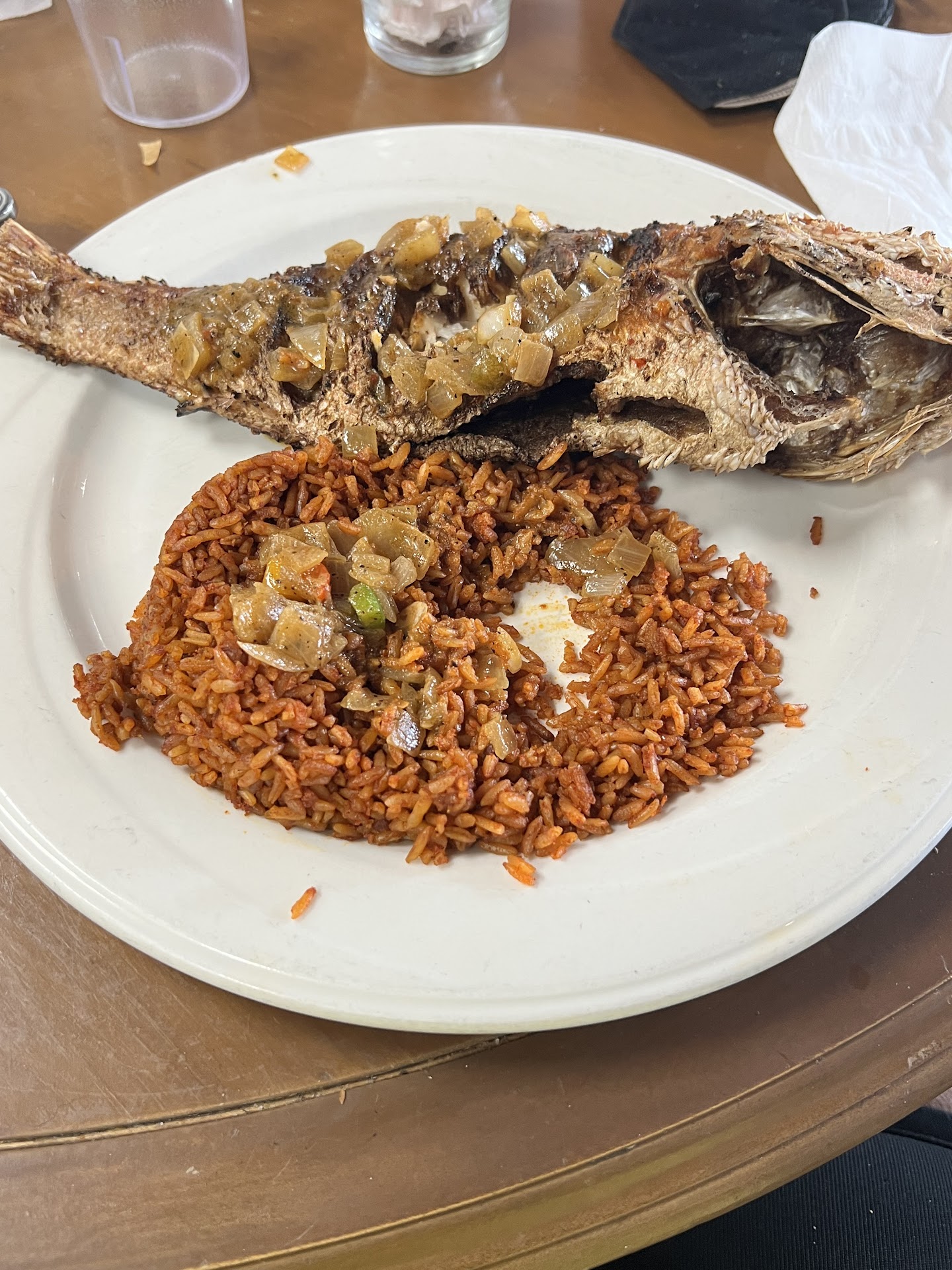Read moreFound this location while trying to find a good grilled fish spot & i hit the Jackpot. The red snapper dinner was super delicious & the gentleman that took my order was the most respectful & customer friendly waiter i’ve came across in a looong time. I guess he could tell it was my 1st time here & even though my order was to go, he set me down & offered several samples of some homemade drinks. The samples were great & everything was great, & i thought about adding one of those drinks to my order, except there was ONE WAITER that was kinda very rude. The sitting area wasn’t crowded @ all, but there were only a couple of tables that were able to mostly sit 2-3 people.. i was @ one of the tables & there was another table literally right next to me. The ONLY difference was the other table had their water pitcher & a few other lil items that i guess they serve their seated customers with. Well, two gentlemen came in & they were waiting to be seated. That’s when the OTHER waitress (MR RUDE), came up to me & asked if i was dining in or ordering out..@ 1st i was confused to why he was even asking me that...So i replied “Im ok, another waiter took my order & it’s to go.” I turned back to my phone & he got my attention again & told me that since my order was to go, can i sit @ the other table. I was like D*M, this mofo that lazy that he cant remove a few items from the next table to sit customers??? I didn’t say anything. I just looked @ him & moved. My whole perception of this place CHANGED IN AN INSTANT!!! My very 1st time here & i spent $40 (including tip), on JUST FEEDING MYSELF, cause i wanted to try some new foods. After Mr Rude made me move to sit the two waiting customers, i had already made my mind up that I WASNT COMING BACK!! Not long after, my 1st GREAT waiter brought my food out & reminded how great customer service should be! So i told myself i’d give this spot another chance, BUT ONLY IF THE FOOD WAS GOOD!! MAAAAAAAAAN, the food WAS DELICIOUS!! Let’s just say that the young GREAT waiter with the short box-cut dreaded haircut & the nice jewelry, along with the GREAT FOOD, SAVED U A NEW CUSTOMER!!! I will return for that Yassa Red-snapper...