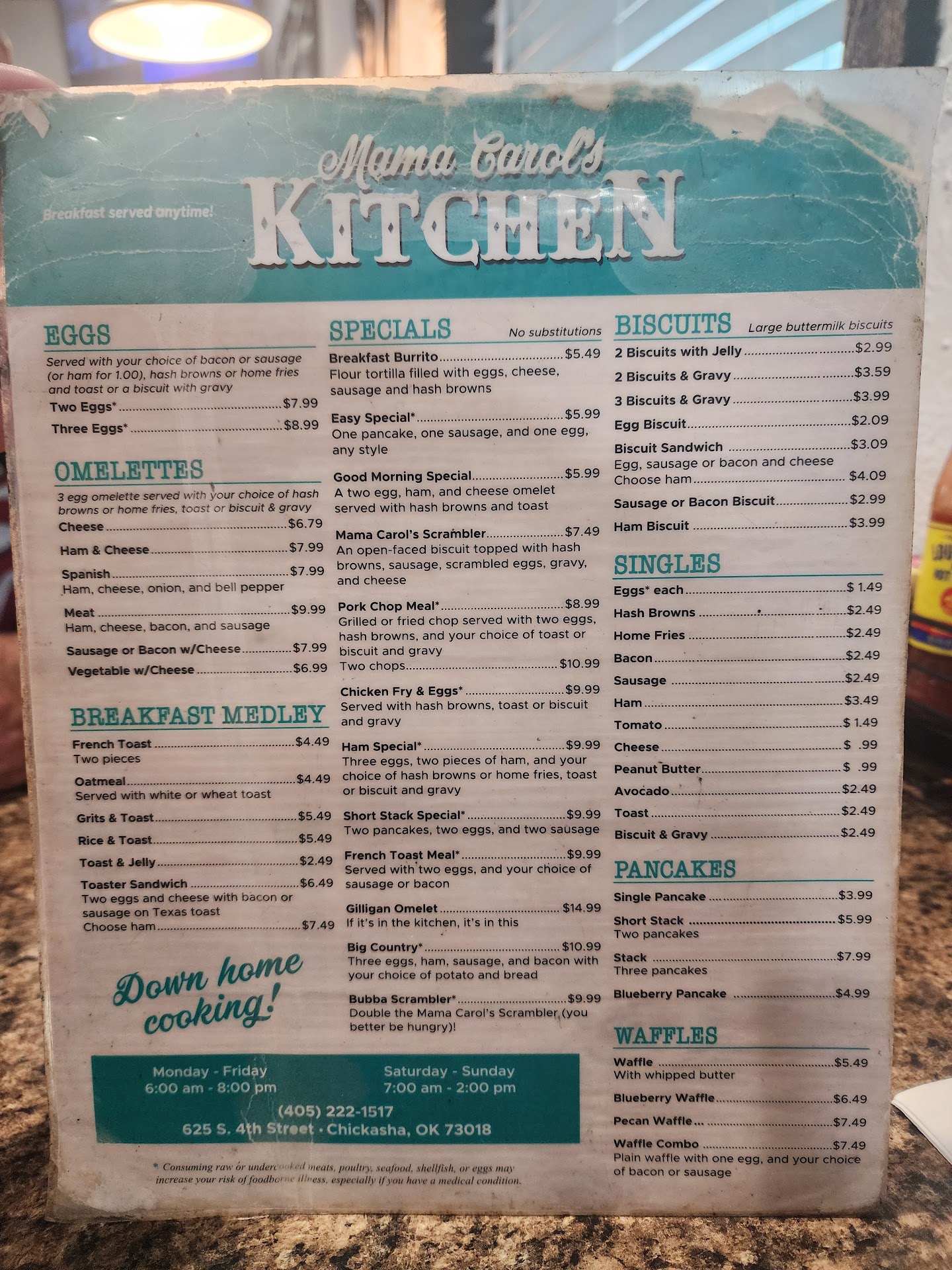 Ā Ā Ā Read moreWe were up for the weekend for a band gig at Legends. We love to take part in the local eateries, as opposed to the commercial restaurants. One thing we love is breakfast. We heard Mama Carol's Kitchen might be busy, but we went for it anyway. We parked in the back and came in what we assumed was the back door, as the cash register was straight across on the other side by the front door. You can see the whole dining area when you come in. There is also a counter to sit and eat your meal. I walked over to the front register/door and made eye contact with the young lady employee, and was greeted with a smile. I smiled and greeted her the same while noting we had 2 in our party. It was explained to me she wasn't sure of the wait time. We'd have to wait for someone to get up and grab their table. It was pretty much "First Come gets it." But you have to watch the back door too, people wait on both sides š Fortunately a table immediately opened up right next to us. We were immediately greeted by our Server Twylah, who brought our menus and asked what we would like to drink. A short moment later, Twylah revisited us to see what we selected from the menu. We explained that this was our first time at Mama's and needed a little more time to peruse the menu. Twylah was hustling it, greeting her tables, bringing out food, getting orders, checking back, cleaning tables, bringing close out tickets, etc. After we placed our order, it was not long before the food came out. The place was PACKED, and the kitchen was "OnFire," getting food out in a timely manner. I ordered way more than I usually do. I usually get Grits & Toast. This time, I ordered grits, hashbrown, cheese omlette with a side of tortillas, biscuit/gravy. Definitely had leftovers. We usually split a pancake for dessert. Everything was great! I did have a little more butter on my grits than I usually use, so I scooped it on to the pancake. š But they were good. My omlette was twice the size than what I usually get in most places. My hashbrowns had just the right amount of crispiness. The biscuit was homemade and delicious. I swear that gravy was Wataburger gravy, without the sausage! I wish I would have ordered a dozen biscuits and a quart of gravy To-Go! I had leftovers but polished off the biscuit/gravy and grits. My guy thoroughly enjoyed his breakfast. He was glad I pushed to come here. He was worried about the wait. Twylah had brought us a ToGo container to load our leftover haul and a fresh UnSweet Tea for the road. We snacked on our breakfast leftovers for dinner after our long drive home. It was yum yum good. When you're done, you waddle your full happy belly up to the register to pay. We had no issues paying. It was the same young lady with her pleasantries as I paid. If we're back in Chicasha, we're definitely going to come back here and ask for Twylah too š Hope you enjoy it as...