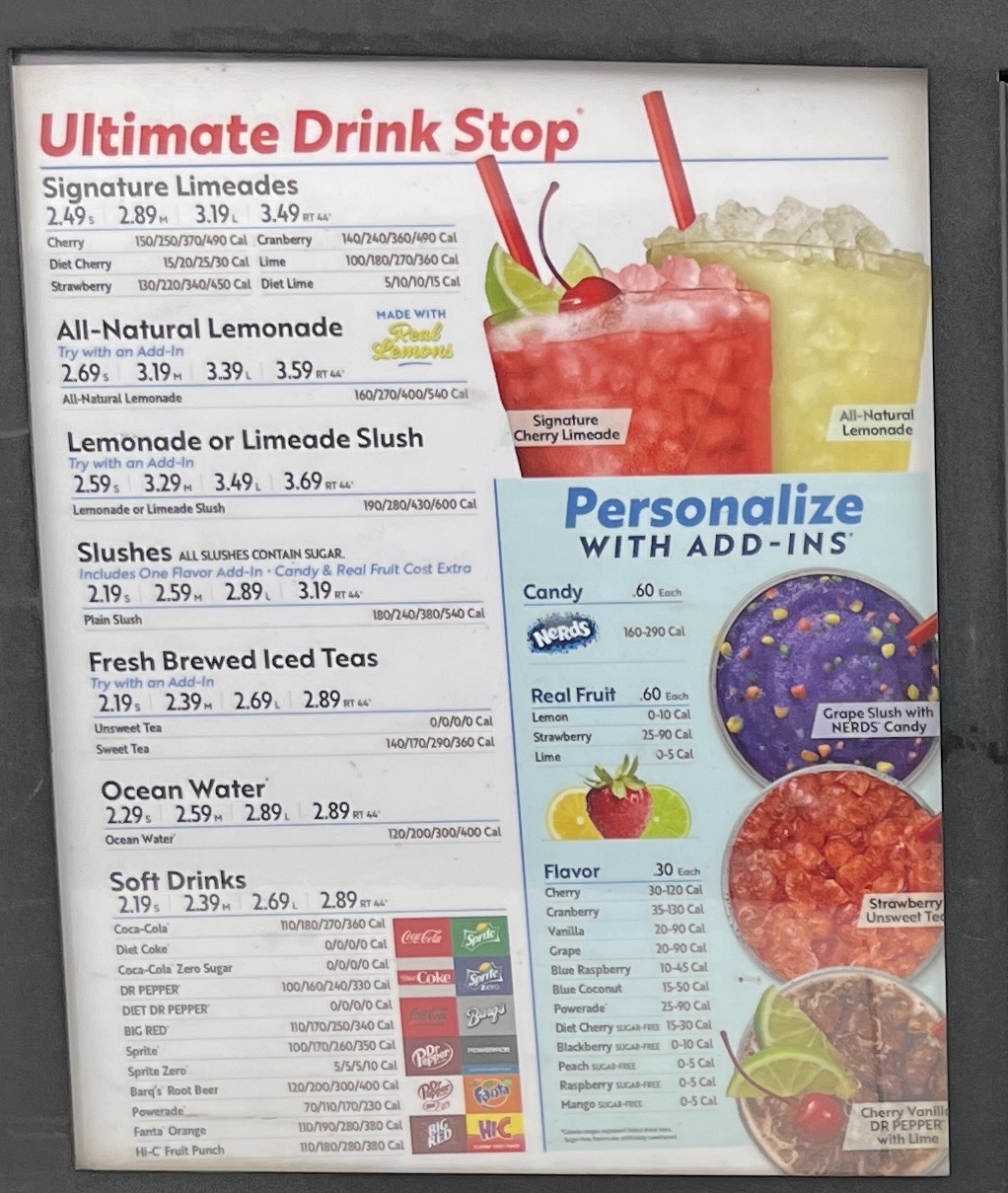 My favorite fast food restaurant in this city. In terms of menu options, they get every listed clear as day, and there is quite a bit to choose from. From breakfast items, to chicken sandwiches, to burgers, melts, milkshakes, slushies, sodas, fries, onion rings, mozarella sticks, french toast sticks, the whole nine yards. Having so many options, and having them stated clearly is a much more refreshing feat than with McDonald's and their menus that are designed to urge you to buy the more pricey options. With Sonic, it's "pick what you want, and place your order already." And let's talk about the prices- Fairly cheap compared to McDonald's and Taco Bell! And with the large amount of options, mixing and matching is just standard practice here while other places have you mix-n-match as part of some deal that gets thrown off by one drink or one side or even just their computers not allowing the option- Sonic's got you! So many options and freedom with placing your order really sells that you CAN get what YOU WANT, and not just settle for preset meal bundles. You get what you want, you can eat in your car or go home, it's all good. It's a hell of a step up from having people in line at McDonald's honk and yell at you for just trying to put your card back in your wallet.