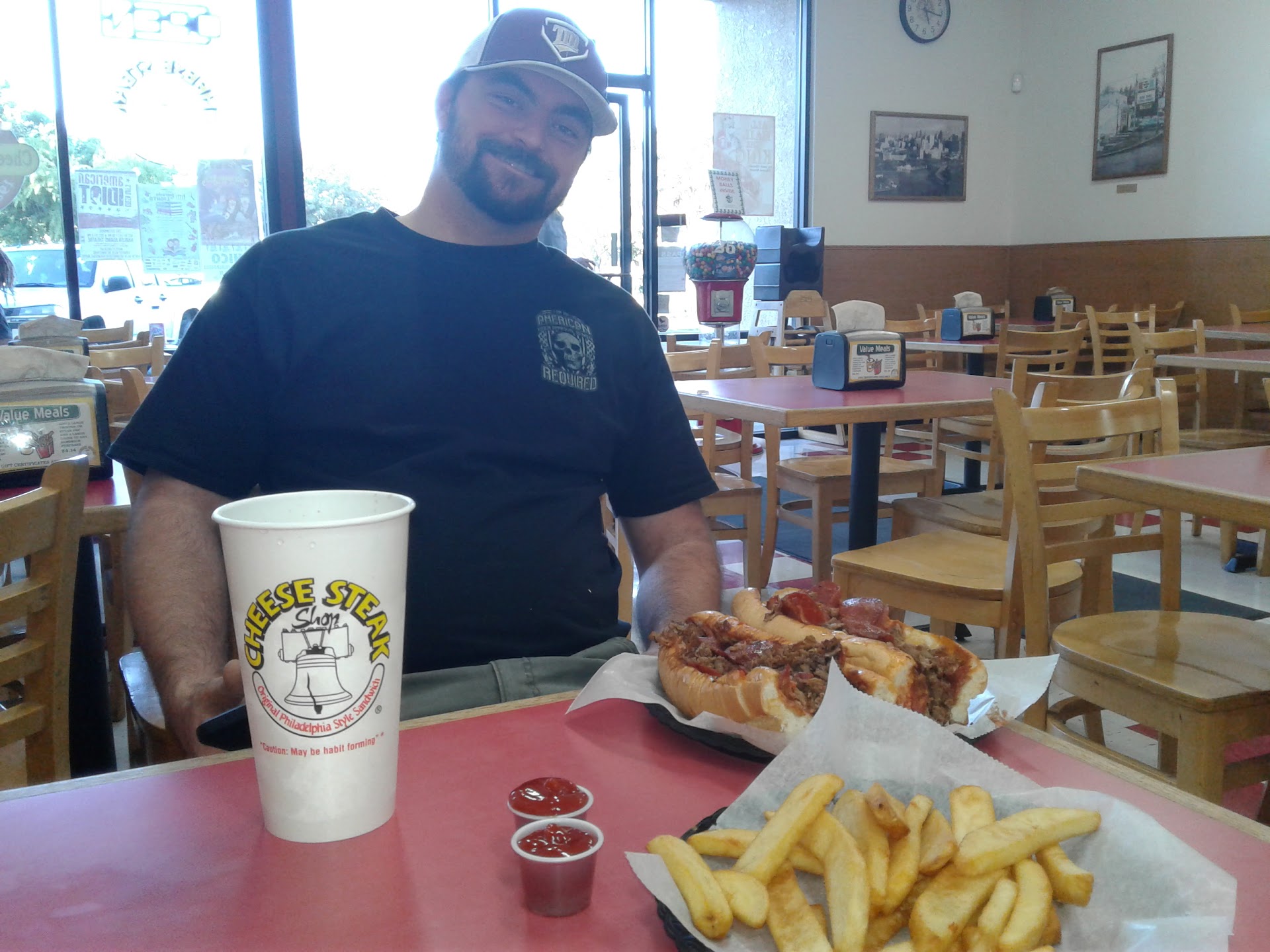The "large" Philli cheesesteak is enough to feed a small toddler at best, and contained more vegetables than anything else. The taste was bland and subpar in comparison to other cheesesteaks I have had during my many travels. I suspect they are still in business due to not having much of a rival market in Chico... If (4) anorexic cheesesteak sandwiches, (2) orders of portion controlled overcooked curly fries, and a $70 bill is acceptable to new potential customers reading this, don't complain afterward and say I...