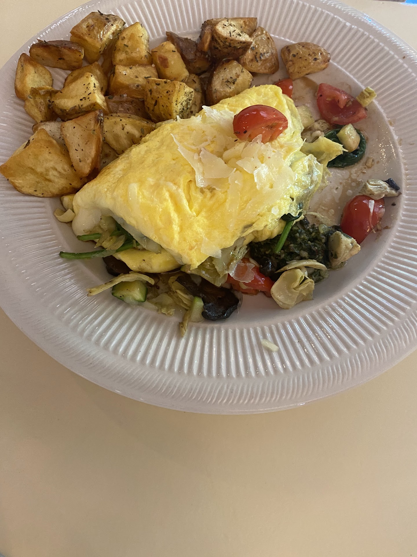 Read moreFirst impressions: nice decor, ample set up between tables, nice uplifting music, and today wonderful AC. Can’t praise that enough as the reigning heat has been anything but cool. Owner, as many observed, greeted us upon entering at around 1:15 PM. Menu a small number of choices, but who needs 100 when 30+ is enough for a breakfast place. Fellow reviewers could not stop praising the place. Food ordered: Veggie Omelette, $16.50. Zucchini, spinach, mushrooms, monterey jack, cherry tomatoes, parmesan, and blistered artichoke hearts atop pesto & a balsamic glaze. Served with herb-roasted potatoes. Was not disclosed the number of eggs utilized, but a safe bet would be 3. Comensal enjoyed the average size dish, nice amount throughout, and roasted potatoes were seriously dressed for the occasion. 4 Stars. Cheddar Chives Biscuits & Gravy, $16 with a side of ham, $5. Curiosity made me order it. Since way back I’ve grown quite affectionate to good gravy. This version boasts of herbaceous sausage gravy, and the order included two eggs. Funny how was never asked as to how I preferred the eggs, which I would have asked for scramble today, but a little past over medium arrived. Kind of unusual for 2 biscuits and gravy +2 eggs become an entree of choice. All by itself. The advertised sausage so tiny perhaps, as to be invisible. Gravy slightly past it’s prime, and biscuits soft and filling, not very much of it, but certainly edible.. The ham small serving, heavily seasoned, dryish and not a memorable one. 3.5 Stars. Water 💦 clean and cold. Service respectable, place including restroom clean. Total $40.59 plus gratuity out the door for around $47. For sure worth the visit, as God knows I had my share of several breakfast places in Chico, some way less appealing so a new one was in...