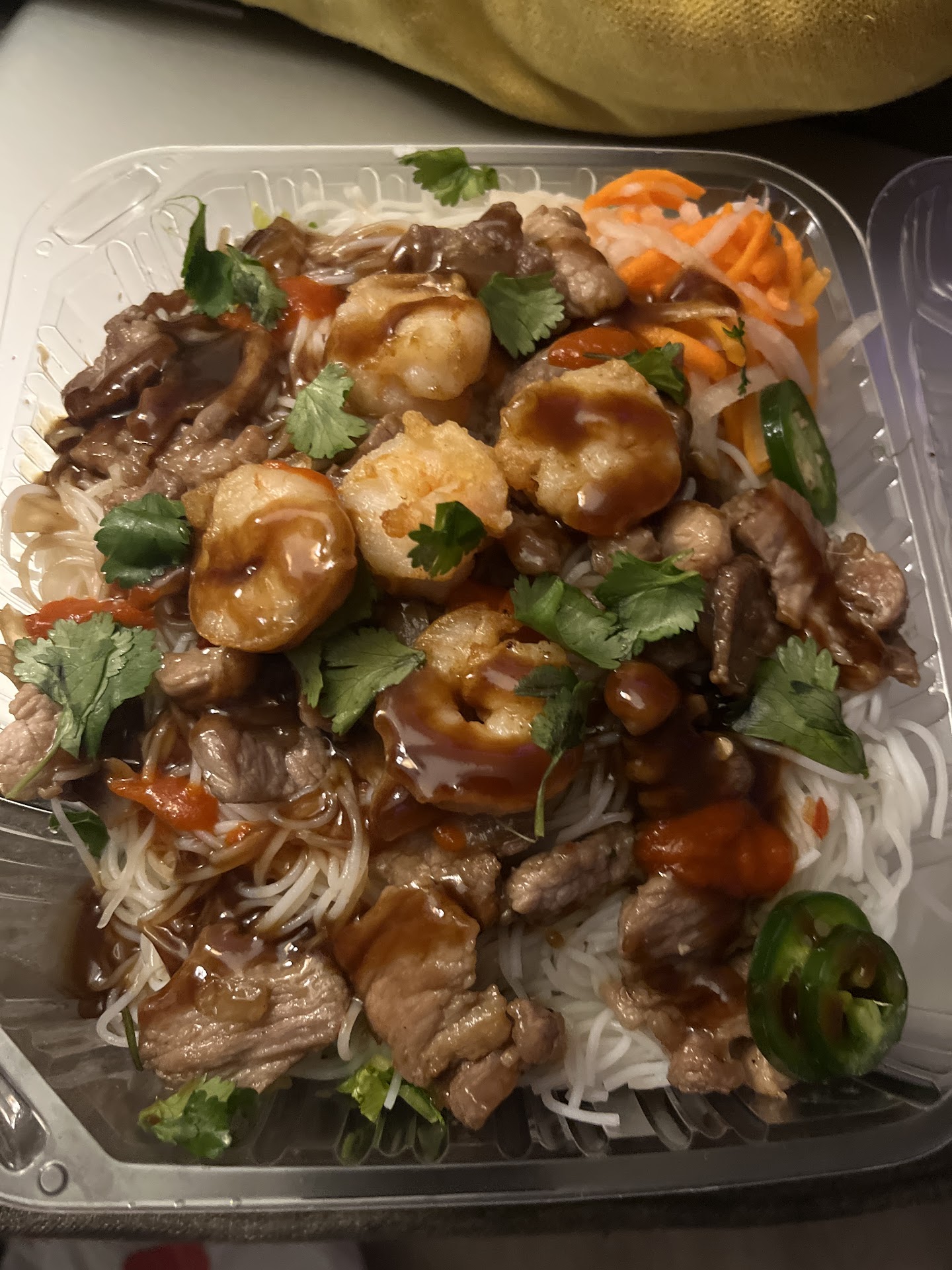 Stopped in at lunch time looking for a quick-bite before going to an estate sale. THAT was my 1st mistake. I knew of other, better, restaurants but went against my better judgment and walked in. 2nd mistake. The place was empty...and I'll tell you why. Only 3 lunch options besides Phö, so I choose the #3...Combination Teriyaki (beef, chicken, and shrimp) with vegetables and rice. The picture included shows what it was...2 scoops of dried rice, ZERO vegetables, overcooked beef and chicken with 3 small shrimp, 1 small container of sauce, and 1 small Luke-warm pot sticker. In so many words, un-edible!! NO amount of sauce would've fixed the palpability of the meat, and after scraping off the top layer, very few bites of rice. I'm sorry...3 strikes...NEVER again will I eat here and I might've found out why the place was devoid of customers. FAR better hole-in-the-wall establishments... I'll just have to look...
