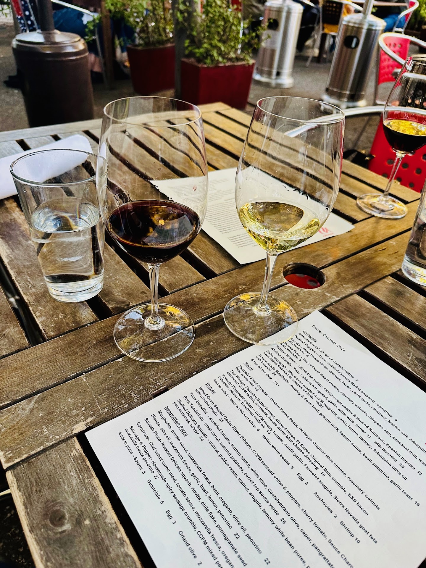 We caught the patio on a perfect Chico evening - not too hot, not yet cold - and it was a really aesthetically pleasant space. Dog friendly, too! Since my friend is a wine club member, we started with a tasting. Hers ended up being complimentary, while mine was not. I don't know of another wine club that doesn't include tastings for the member + 1-3 guests. It was odd, at minimum.