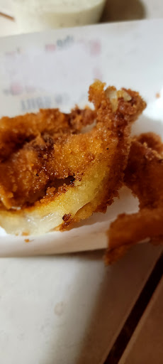 The onion rings were very disappointing. Their price was $4.69. The portion size was pretty good, but the flavor and cooking execution missed, badly. Very bland batter with no noticeable spice / salt. The first onion ring I picked up disintegrated instantly. I found that most of the onion rings did not stay together and became a pile of onion ring crumbs. The batter fell off the onion, while it managed to be overly crisp on the outside, and mushy undercooked on the inside. They tasted of old oil. The onion rings came with their signature "ranch sauce", in a somewhat large portion cup. I opened the cup to find it maybe 1/3 full, which would normally be disappointing, but the ranch sauce was runny and bitter.