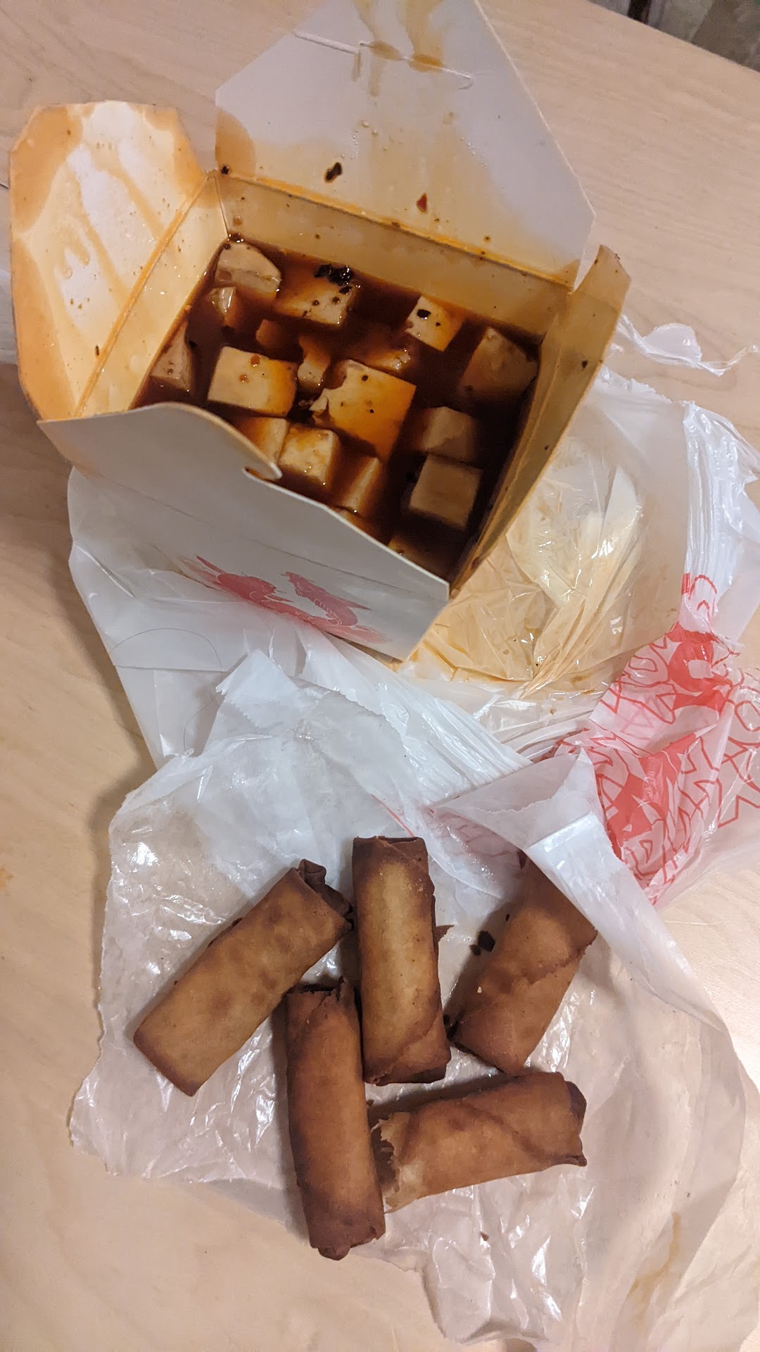 The spring rolls were quite burned and I still would've powered through them. However, they also smelled/tasted of rancid oil and were not edible. I'm pretty picky, so I wanted a second opinion and I asked my eat-everything boyfriend (with an iron stomach) to taste it and verify that I wasn't overreacting. He was baffled by how bad all of it was. Thirty bucks straight in the trash. Then the oil made the trash smell so bad that we had to take out the trash.