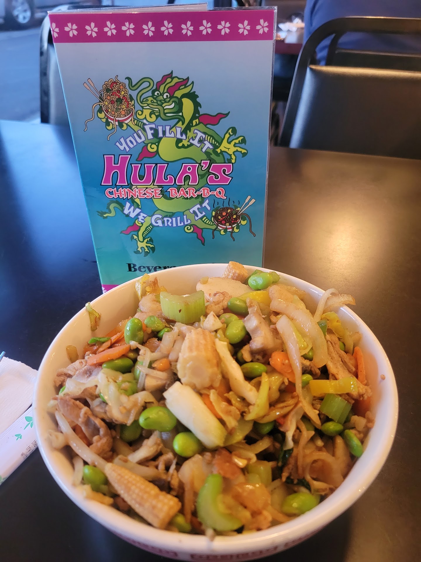 Today was a fairly warm day and the AC in Hulas was just not cutting it for me. At were seated away from the ceiling fans, which didn't help. Next, they were out of Modelo. A real shame and I ended up just getting Coors Light, for $5.50 a pint. This would be understandable, but this was a Friday, the first day of their work week. For lunch service no less. Somebody needs a taking to in management. Either than or the supplier needs a serious taking to. Next, the price. Hula's has never been the cheap option but between the 5x+ upcharge for the beer and the high price of single-bowl lunch, we ended up paying $50 for lunch. Not an everyday mask for sure. I understand that California has ruined the cost of eating out but that's still a factor. The chicken bok choy soup had a strange, chemical taste to it and was very peppery, so my mom, who has chronic dry mouth, want able to eat it and I just didn't love the taste, nor the disturbing lack of, well, chicken Finally, it's been over 5 years since I read last in, and I get that Covid regulations ruined just about everyone who did self serve but the removal of lamb from the protein choices kinda sucks. Last complaint: the fortune cookies were unwrapped and pretty stale, but who cares about the cookie?
