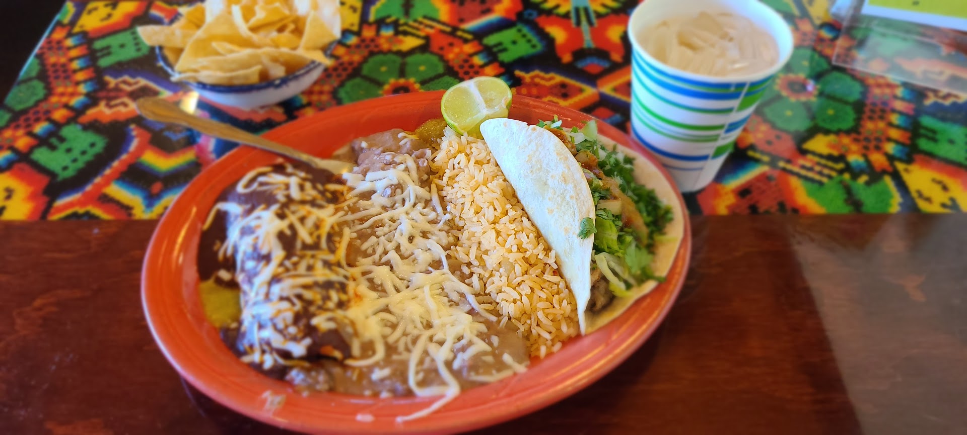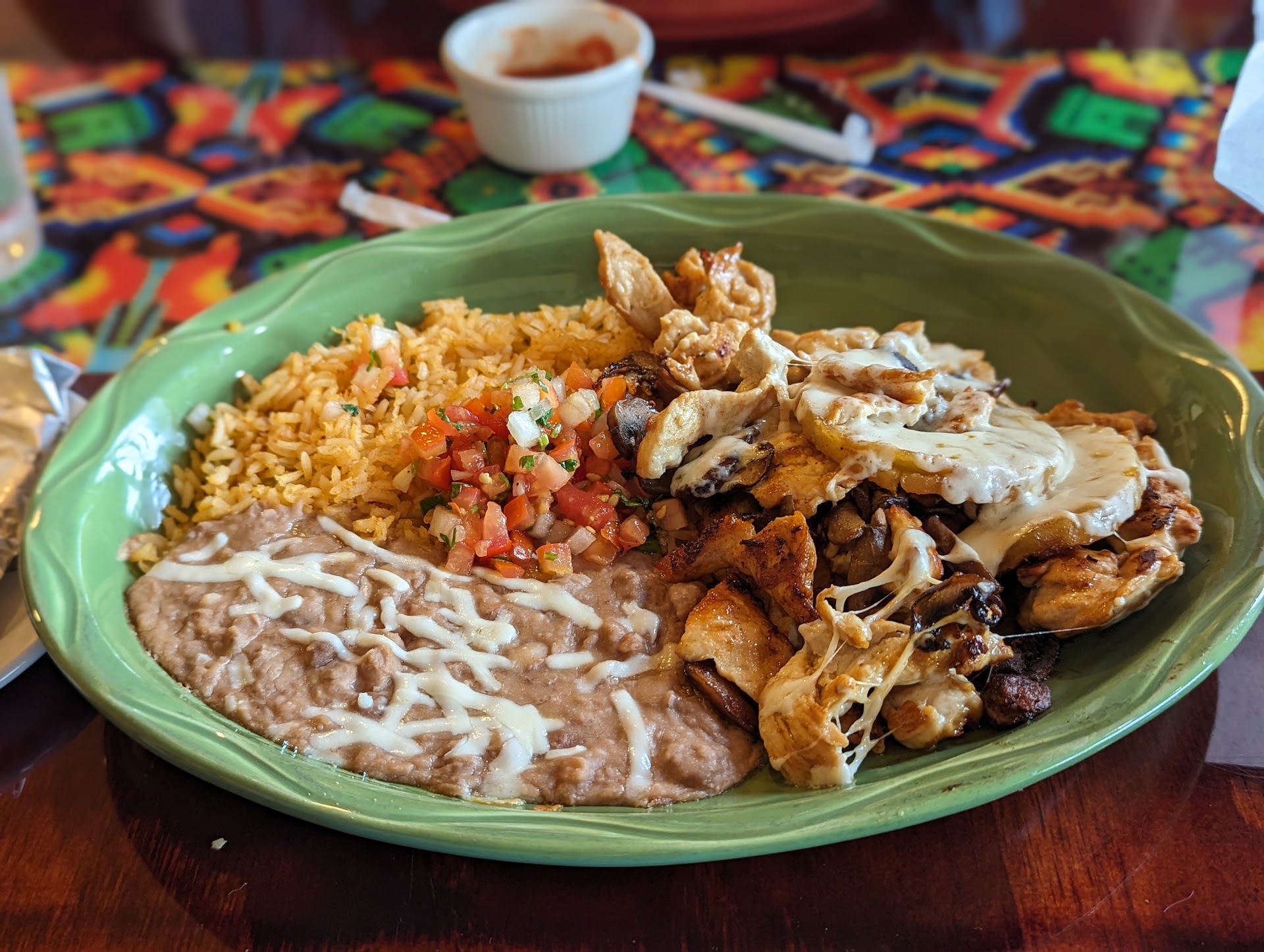 Also, everybody's dishes seemed to be plated in a way that the beans and rice were spread out cartoonishly large to look like more food. The refried beans were thin and soupy tasting, like they had been thinned out with a little water.
