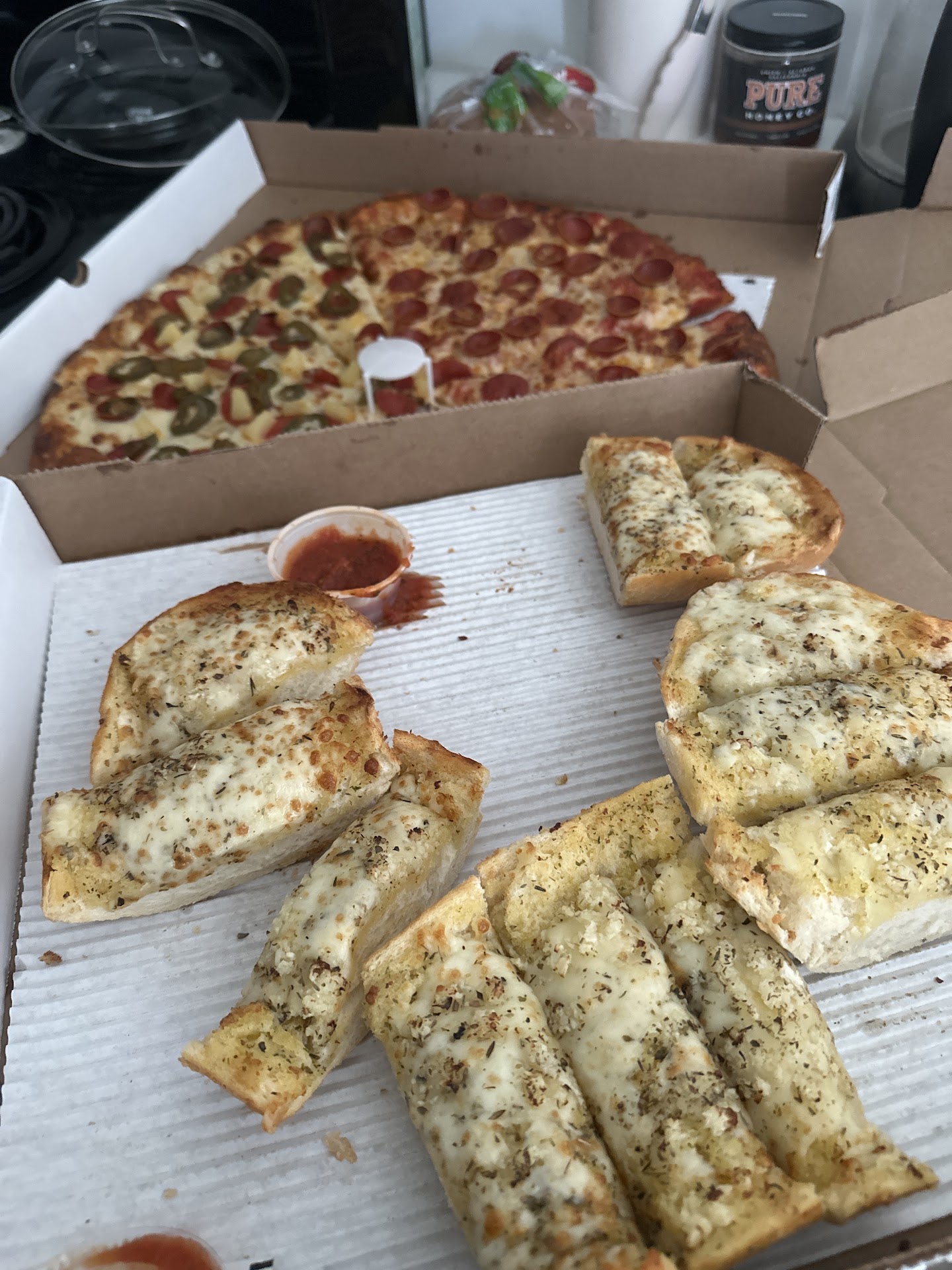 Ordered on doordash and it was very quick and timely. When it got delivered I ate the cheesy bread first and it was super good, I loved it! The pizza, however, wasn't cooked all the way through, which was kind if disappointing. This pizza looks super good too but was a little sad it wasn't cooked all the way 🥲