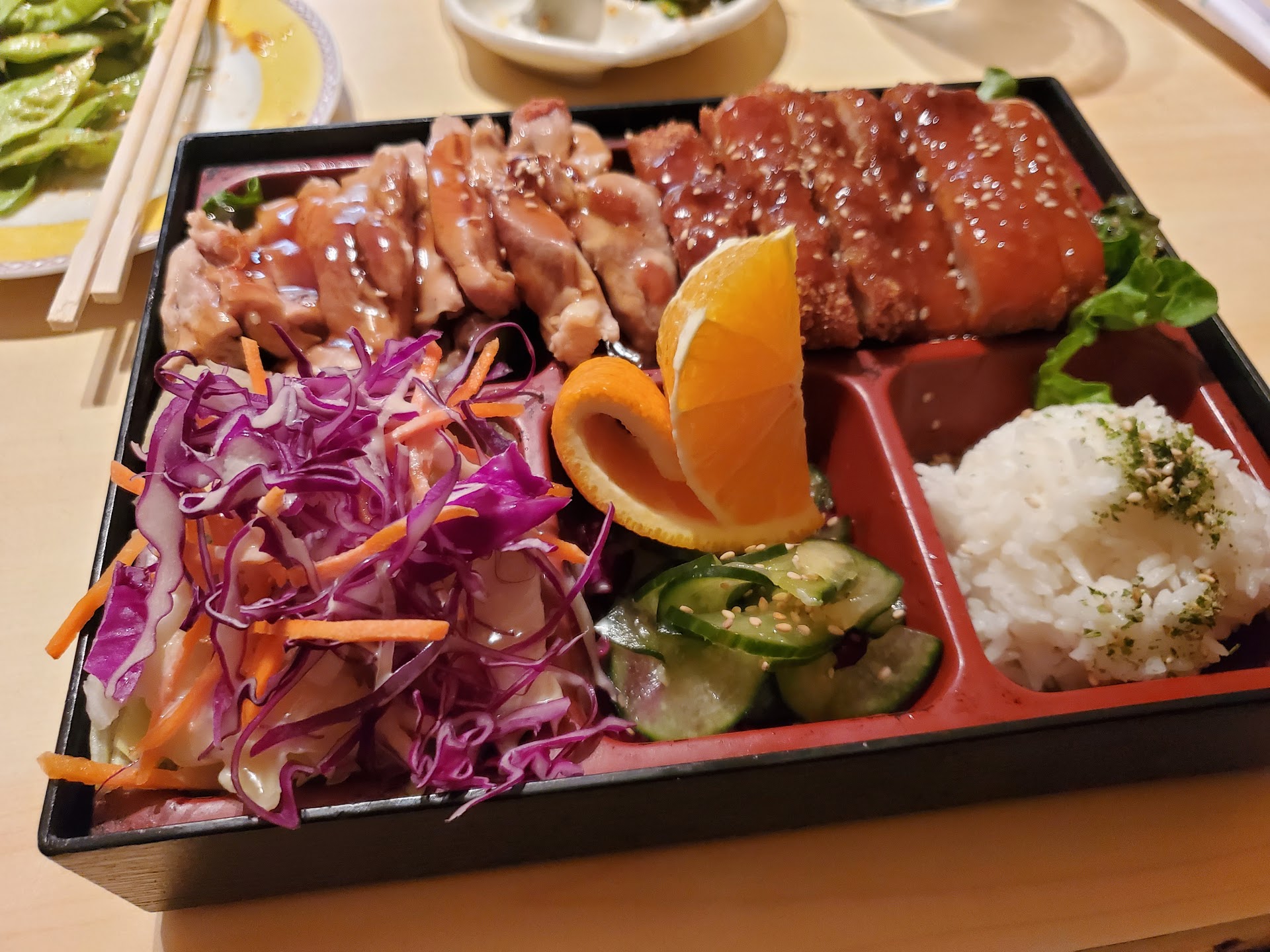 Read moreOverall 4 stars - the interior was clean and pretty. The service was excellent, efficient, and very fast. The food was okay - some really good and some just okay. I had the peking ribs - I asked the server about them and he describe d the kind of meat correctly and that they are served with thin slices of onion. I didn't know to ask how they are prepared - which is battered and deep fried - not grilled. Then, they are smothered in a tasty, sweet ginger sauce - that has the most red food dye in it that I have ever eaten. They were good but about 10x the calories I was expecting and didn't need ANY food dye, and certainly not the amount in there. My son ordered the General Tao's Chicken - he said it was good. We added on the combos to our meals so they came with soup, rice (either pork fried or steamed), and a small appetizer plate which included 2 fried egg rolls with the requisite bright red dyed sweet/sour dip, 2 fried won ton shells, and two paper wrapped fried chicken pieces which were delicious. We didn't know about the appetizer plate so I had also ordered the vegetarian lettuce wraps appetizer - which is probably the best deal of the night. It is a huge plate of diced mixed grilled veggies, a half head of lettuce, and a savory sauce to drizzle on the lettuce and veggies. We tried it but brought most home for lunch today. There were a bunch of chairs stacked outside one door which was a bit strange - at first we thought maybe they weren't open but finally saw some folks heading in another door so went on in. There is a sushi bar and Japanese menu also - mostly rolls - and the miso soup we got with our meal...