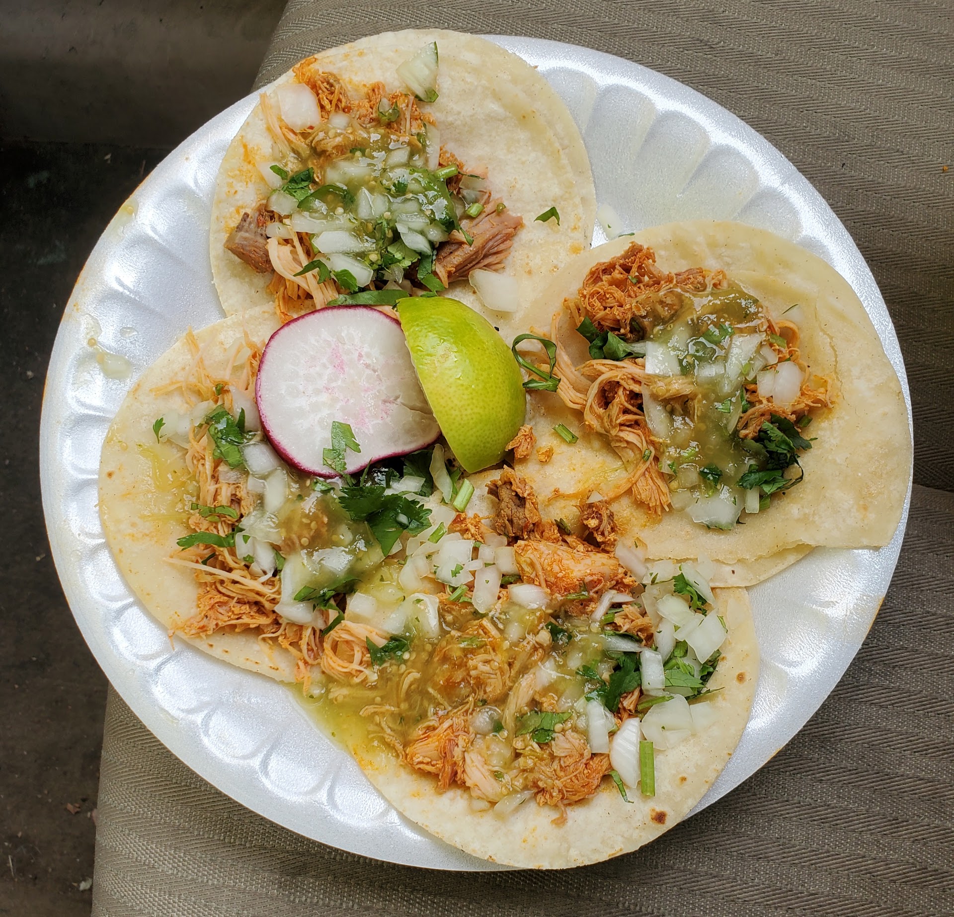 I've put this review off for a long time. I've frequented this food truck a few times over the last 20yrs...but it's time to spread the word. I'm highly disappointed at the food, as it HAS declined in taste and value. I picked up 8 tacos...4 chicken and 4 beef (pictured). 1st, they only offer beef, chicken, pork, and lengua...NO Barbacoa. 2nd, the meat can be dry and overcooked, and that's why they rely on a green sauce to top-off the tacos. Consistency can also be a problem as well, whether it's the onions and cilantro, or the same amount of meat on each. And while the tortillas are grilled, they can be burned if left on the grill too long. The addition of radish slices aren't really necessary...I'd prefer carrots. Prices are $1.25 per Taco, even ON Tuesday. It used to be better food, but I'm sorry to say they've become complacent in their position. There are now better, cheaper food trucks in town...I'll get to more of them over the...
