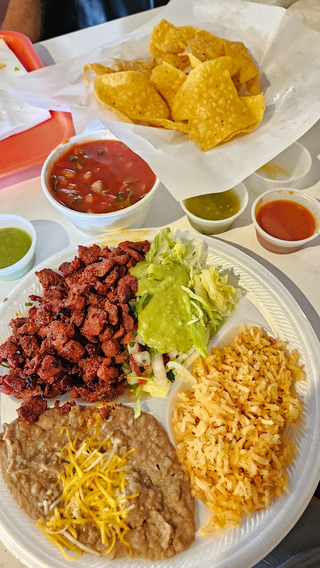Read moreFirst thing that set me off is that they don't greet their customers when you walk in. And if you like to order at the counter like a fast food place then this great for you . There was 4 of us and I had just ordered my daughters meal and he's like is that all. Umm no there's 3 more orders 😒 felt so rushed to look at their menu . With him just starting at us. chips and hot sauce is extra. Then they call your number out to go get your own order. Food was tasteless just like boiled meat no seasons at all. Warm not hot at all I'm just now seeing all these bad reviews I hope we don't get sick on the way back to Amarillo. Save your money and go to McDonalds. Really wish they had a zero star...