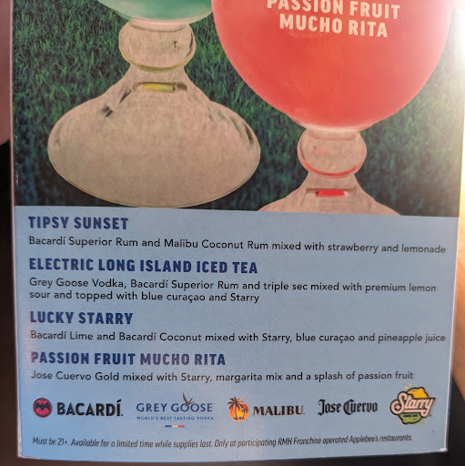 Read moreTonight was the first time I have eaten at Applebee's in over 15 years. Every single time was a dine in experience, but tonight was different. For the first time ever, I got take out.....only cuz my girl wanted it. I literally ordered my food, and it was ready 20 minutes later. The food tasted amazing but the accuracy of the order was my issue. I asked for no onions on my burger and there was a plethora of them on my sandwich. I ordered a shark bowl drink to go and did not get it. I asked the waitress about it and she said" let me check and see if the bartender got it". I didn't hear back from her, I ended up going in 10 minutes later. So I walk up to the bar, where most to go orders are picked up. I have my receipt clearly in hand, and listen to the bartender talk to a customer for 5 more minutes. She then asks, do you have a to go order? Seriously?! I have a receipt in my hand, I clearly have an order. I finally see the waitress that brought my order......15 minutes before hand. The bartender finally makes my to go drink, 15 minutes later. I finally get to leave, after ordering curbside pickup. Funny, cuz I had to go into pick up something that was forgotten. Now my food went from being warm when I got home to being cold. I wont be back for another 15...