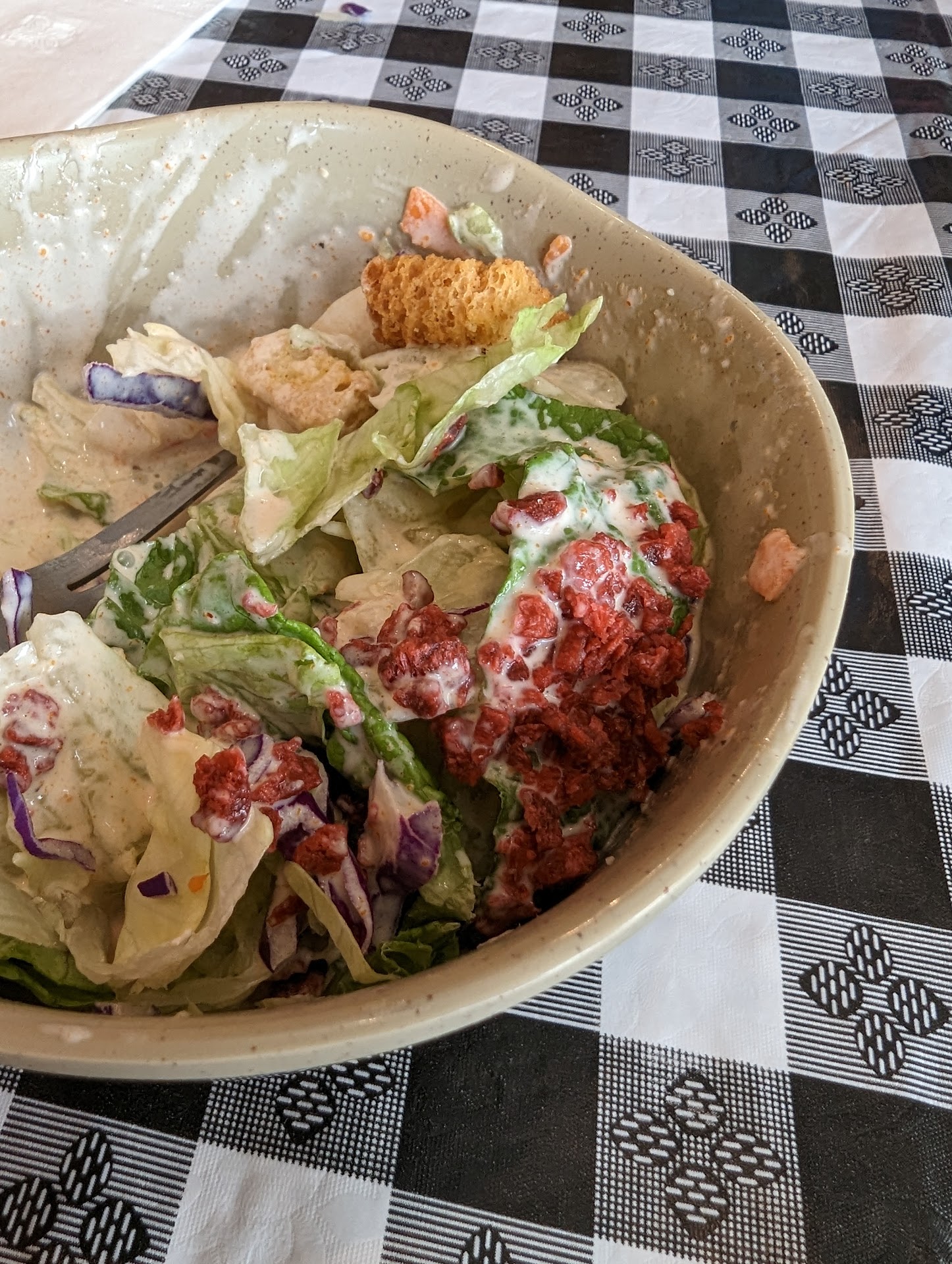 The salad came with what was clearly packaged bacon bits and croutons. Now sure, we didn't come here for health reasons, so I won't get into the details of packaged bacon bits. However, it does give the salad a very cheap feel.