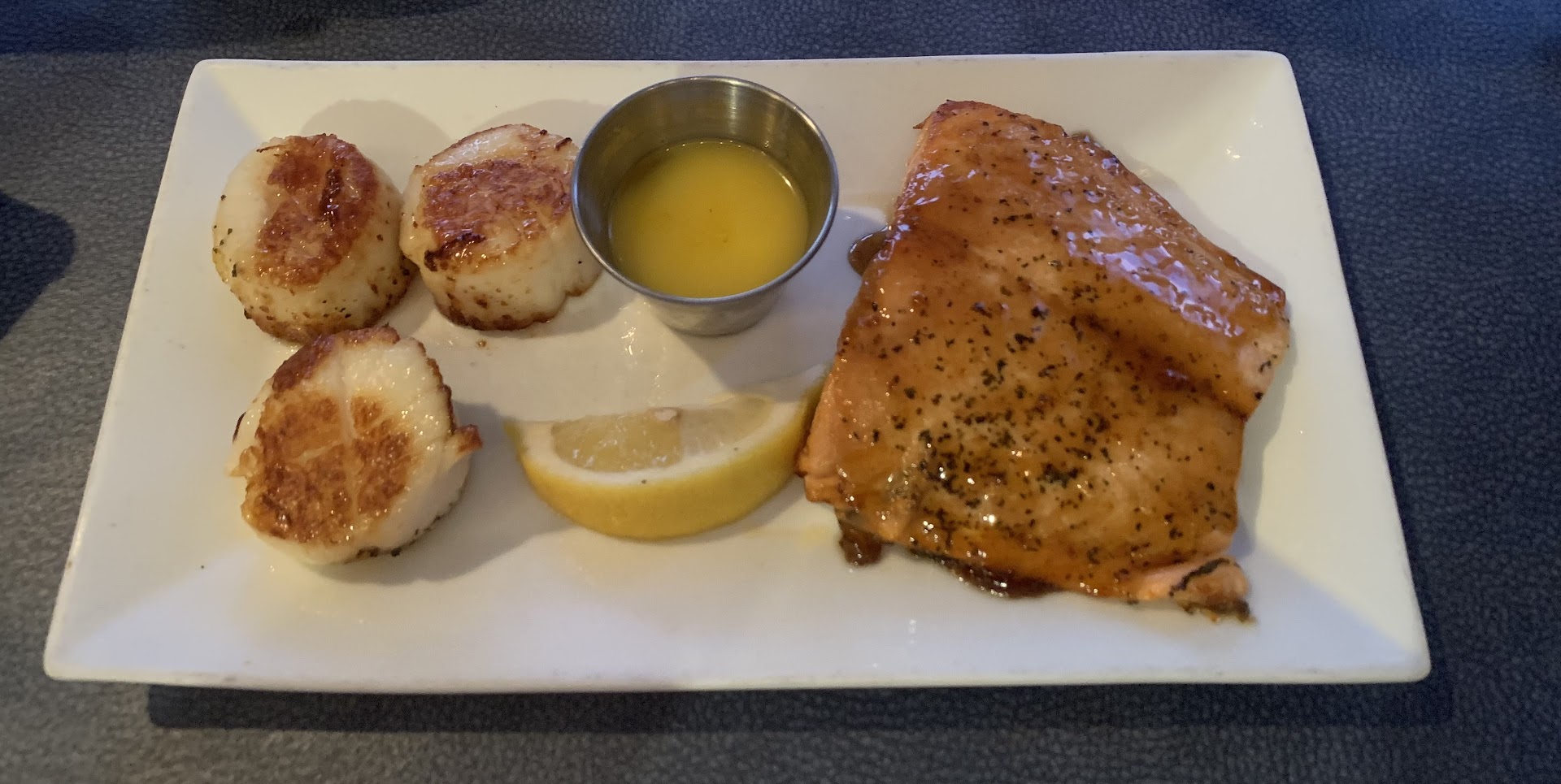 After perusing the menu and ordering drinks and an appetizer of the day (Balsamic glazed Brussel sprouts; absolutely delicious!) we placed our main entree orders. I chose a daily special of Bourbon Glazed Atlantic Salmon paired with Broiled Scallops. I think the picture speaks for itself; IMO, for fine dining, the taste and portion size were about as perfect as can be. It’s been three days, and I can still remember the flavor and texture of both the scallops and the salmon; to me this speaks volumes of the quality of a prepared food.