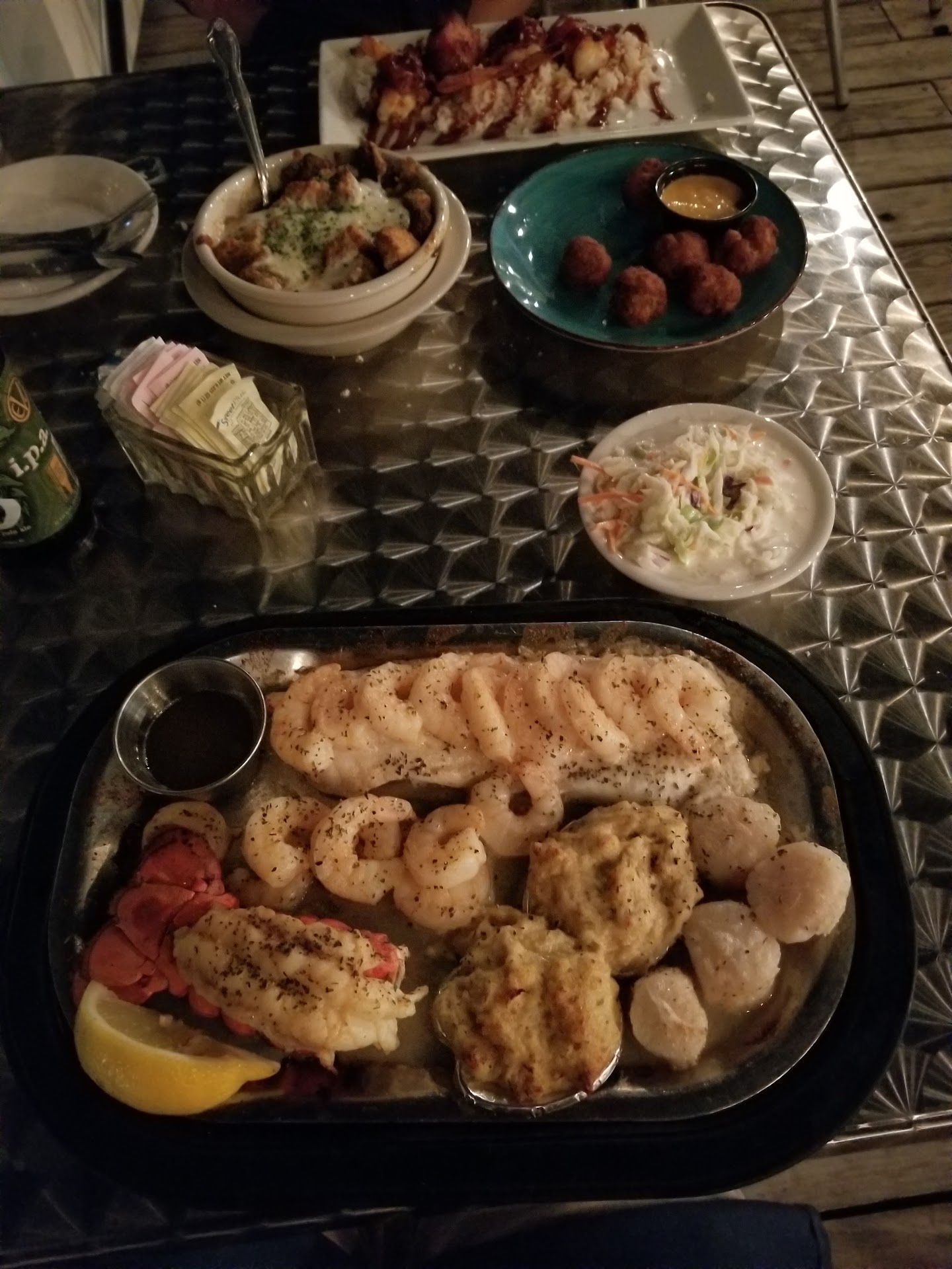 Despite calling mid day on a Thursday before a holiday weekend, the staff was able to find a 7pm reservation slot for our party of six. We arrived a few minutes before and were promptly seated at our creek side window table by the very courteous staff. The decor was very on point; lightly beach themed but not over the top. The dining room felt open and spacious with half height walls in some places to give a sense of per table privacy between larger groups. There was just the right amount of tables to give the dining room the right feel of comfortable ambience without feeling crowded in or lost in a sea of tables. The views out the windows were amazingly picturesque, especially when dining during sunset hours. We did not have time to check out the outdoor dining area unfortunately, but plan to in the future.