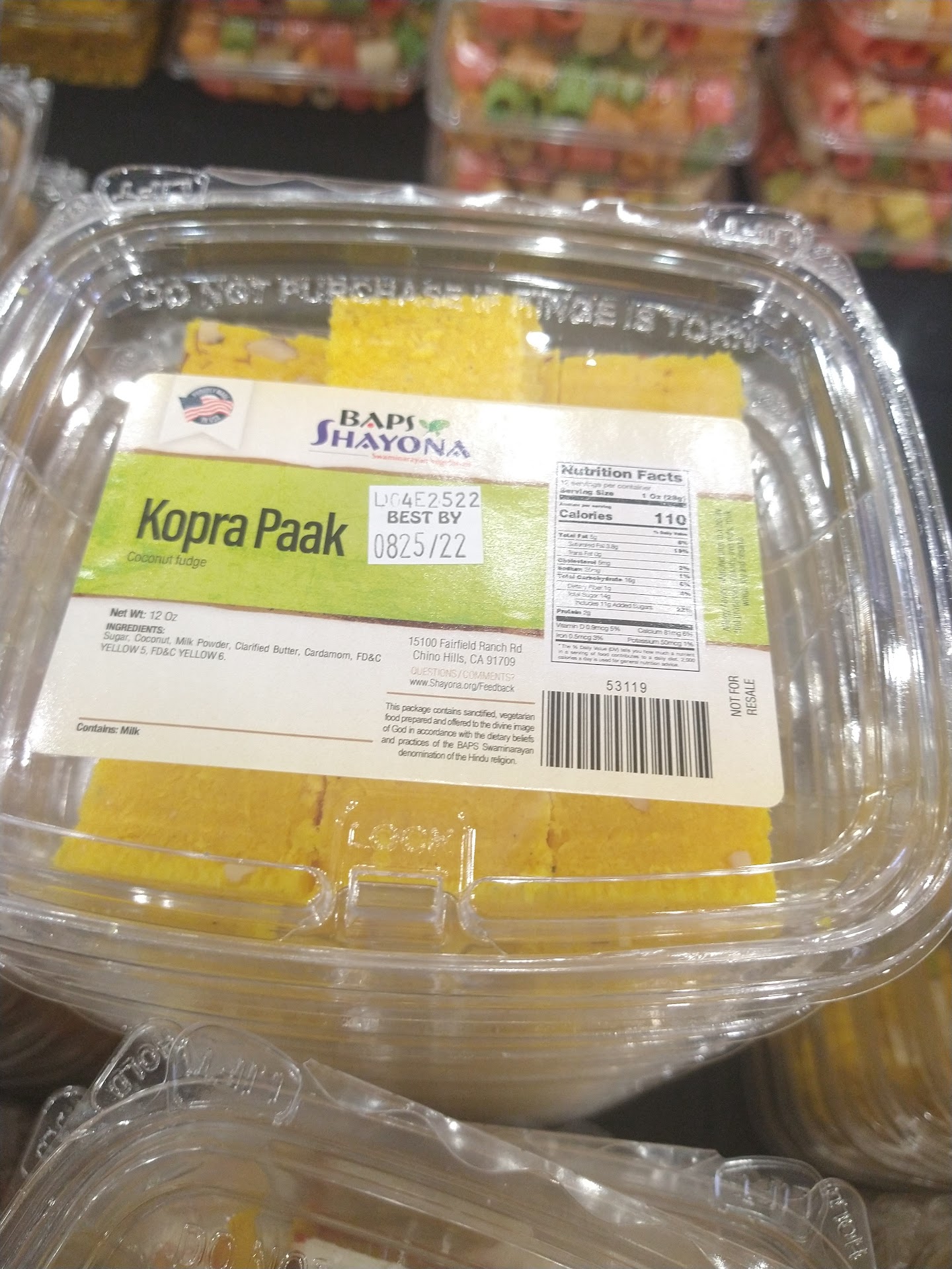A piece of Kopra paak (I don't like this one because the coconut is dry. I bought a whole container once, and it has a weird fat smell. I don't know what it is),