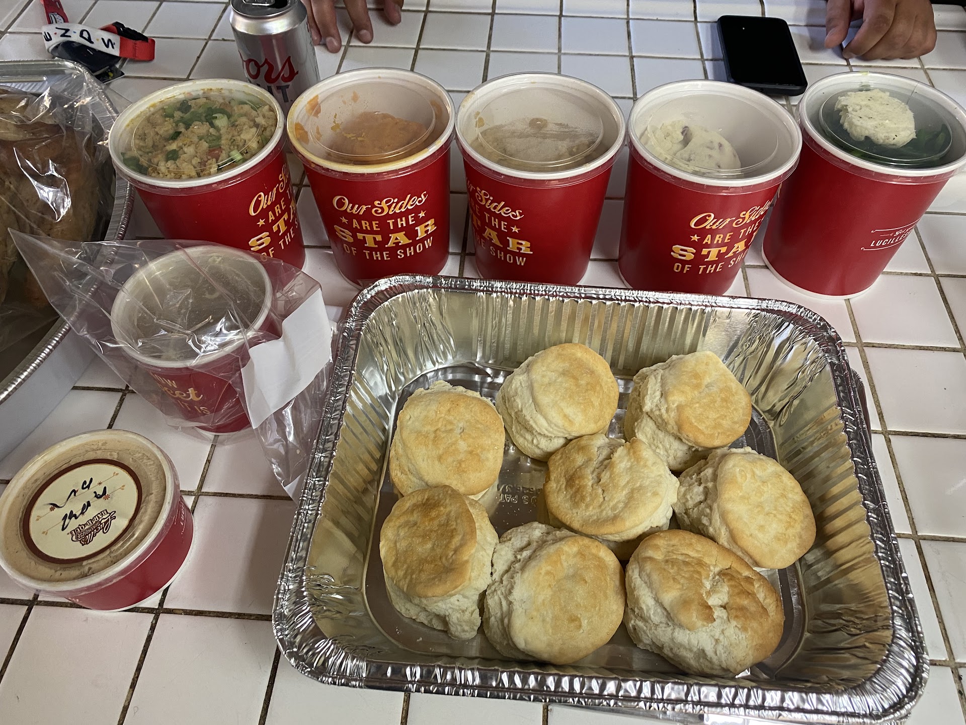 Read moreWe love meeting friend's at Lucille's! We recently had a birthday party of 16 on a Sunday evening around 5pm. Reservations definitely required! We were seated in the outside patio in the back which is reserved for larger parties. Why bother the other, normal diners with extremes of tomfoolery!? Things got off to a great start, service-wise, as our server started taking orders fairly quickly. Soon we had beverages and biscuits served all around. If you've ever had Lucille's sugar biscuits, (delicately crispy on the outside, deliciously soft on the inside) you know you're having a treat and they are twice as good when accompanied by sweet apple butter and a Peach Lemonade! Unfortunately, the servers must be on an Apple Butter rationing order as the biscuits are always accompanied by one miniscule dollop, (dare I call it a serving?) of the Golden nectar to be shared (i.e. fought over) amongst your companions. Even pleas to our server of more apple butter please, went undelivered this night and, alas, the biscuits were only superfluous to our meal. No matter, as dinner was served by a bevy of servers descending on our table bringing our desired first courses of salads and soups, of which mine was a house salad with Ranch. I should have remembered to order an extra helping of the dressing as I usually find my desire for full salad coverage lacking, as was the case here. No matter, I was delivered a gravy boat of goodness fairly quickly (obviously no rationing of the Hidden Valley gem!) and the first course consumed. The noise level in this large room addition increased exponentially as other large parties were seated which soon had us at a disadvantage when the main course arrived and the various dishes were called out. Most were correct, a few had tweaks needed and our one, special medicinal, gluten-free request, as far as I was aware, came out perfectly prepared and delivered. I did not hear of any complaints with food although I found the fried chicken just a bit too peppery for my white-girl taste buds. Graciously, the hubby was forced to eat my shared portion (poor man) and I enjoyed the baked potato with another rationing of condiments. (What is with the tiny amounts of much wanted and needed condire, Lucille's?) Soon dinner was over and the birthday song sung (oh, sung very badly on purpose. Our apologies to our fellow gastronomers.) I soon realized as I, with my requested straw, drew down on the watered down remnant of my Peach Lemonade, that it had not been refilled all night. Sadness. The food and drink were fine, albeit rationed and the service was merely adequate. Devoid of the niceties which serve (pun intended) to make a meal spectacular, and the experience of eating it so, Lucille's receives four stars for their attempts this evening with service at three point five stars if I could...