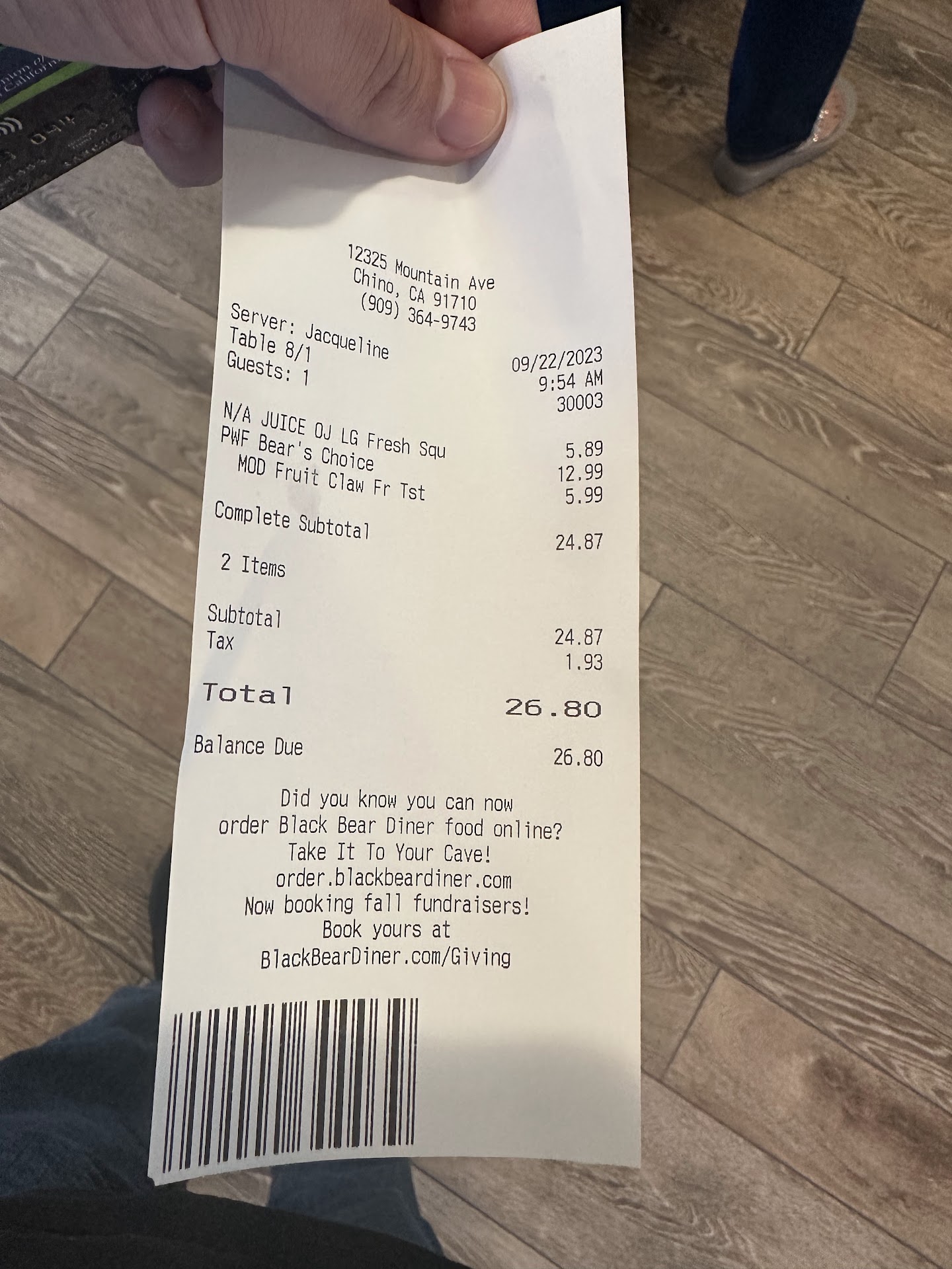 Read more$31 for one meal? Iâm not usually one to gripe about prices. I think if youâre serving something great, you can charge whatever you want because itâs an experience and a memory that will last. This, however, seems egregious. I tried this meal before at a different location and loved it. I got the black berry stuffed French toast. It was delicious the first time I ever had it. Itâs like a fat bear claw but instead of apple, itâs black berry. Here at the chino location, it was alright. Wasnât bad. I can make excuses all day long for why this might be. I might not have been so hungry. Different locations will always vary, even with the same meal. This is a big business with workers that probably come and go so balancing consistency and quality is always going to be tough. I also believe in tipping so even though I was handed a bill for $26, I didnât automatically jump to punishing the servers by leaving out a tip. The servers were great. The cooks are working hard. Theyâre all doing their part⊠Iâm just concerned because for a bit of scrambled eggs, 2 pieces of bacon, an orange juice and a French toast, $26 seems pretty steep (not to mention the 18% tip I added on). While I feel like itâs fine, I donât really feel inclined to stop in again. I love diners and I feel like my money would be better spent at a mom and pop shop where Iâd get just as good if not slightly better quality for half the price and it would be contributing to a community business, not a giant conglomerate that even posts on their paper how many locations they have and what year they opened. Seems like a weird flex for a place that wants to seem down-home. Iâll come back with family if family elects to come, but on my own, Iâll be...