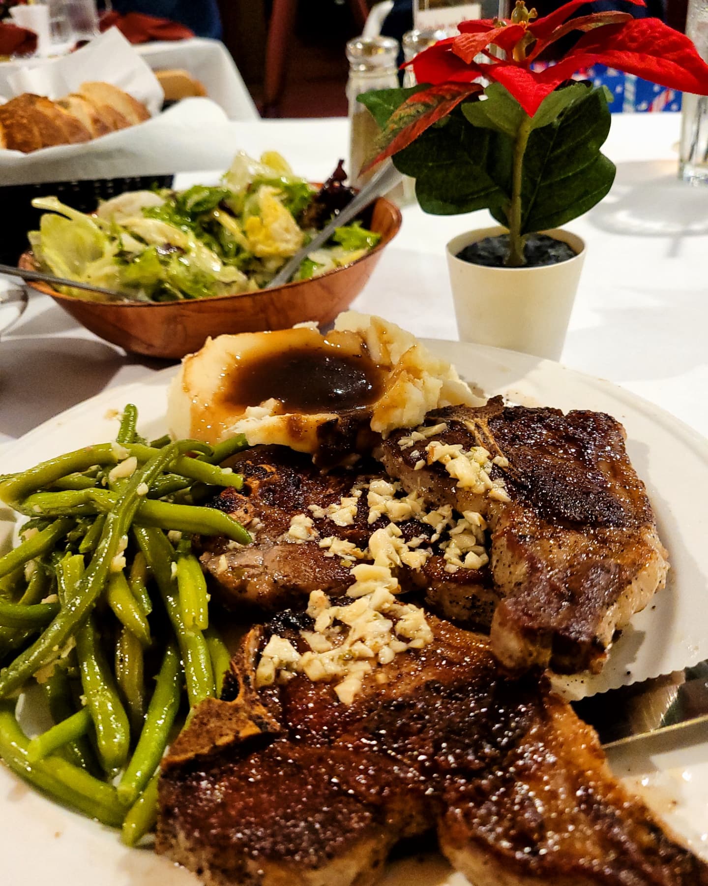 I had three scrumptious pan seared lamb chops with a crispy, flavorful outside and tender meaty inside smothered in chopped garlic. The lamb was excellent, full of flavor and prepared well with sides of mashed potatoes and garlic green beans.