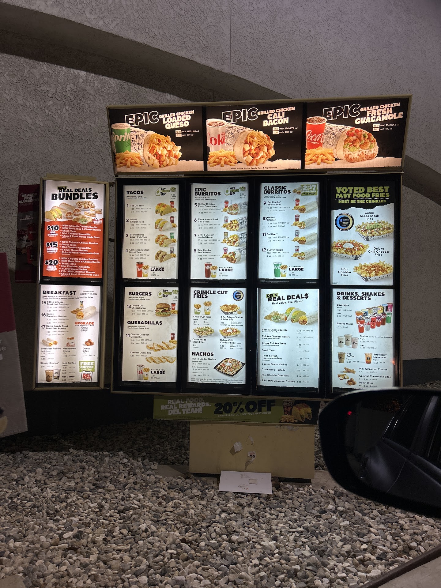 Read moreDon't bother going to this del Taco for food after midnight I've tried to order food four different times from there and in every instance it was at a different time of night one night I went in there at 1:00 a.m. one night I went in there at 3:00 a.m. the other two times I think we're at like 4 and 2:30 am every time though no matter what time it is if it's after midnight and before 6:00 you cannot order anything that is fried you can't order meals because they have french fries that come with them so it's pretty much you can't order anything unless you're ordering they're cheap bean and cheese burritos or something like that because almost their whole menu is fried items just trying to give you guys a heads up don't waste your gas to your time and your stomach growling to go eat there cuz you probably...