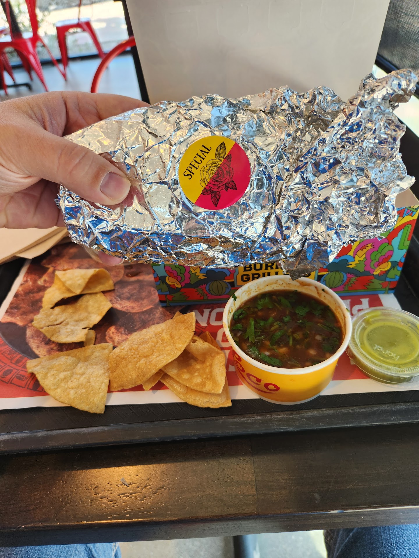 I didn't have any more time to lose, as I was on my lunch break, but the only credit I'll give them is that someone figured out there was a mistake & I was eventually given the right item, but by then, I was already halfway done with the burrito. Chips that came with my order were few (I counted 7).