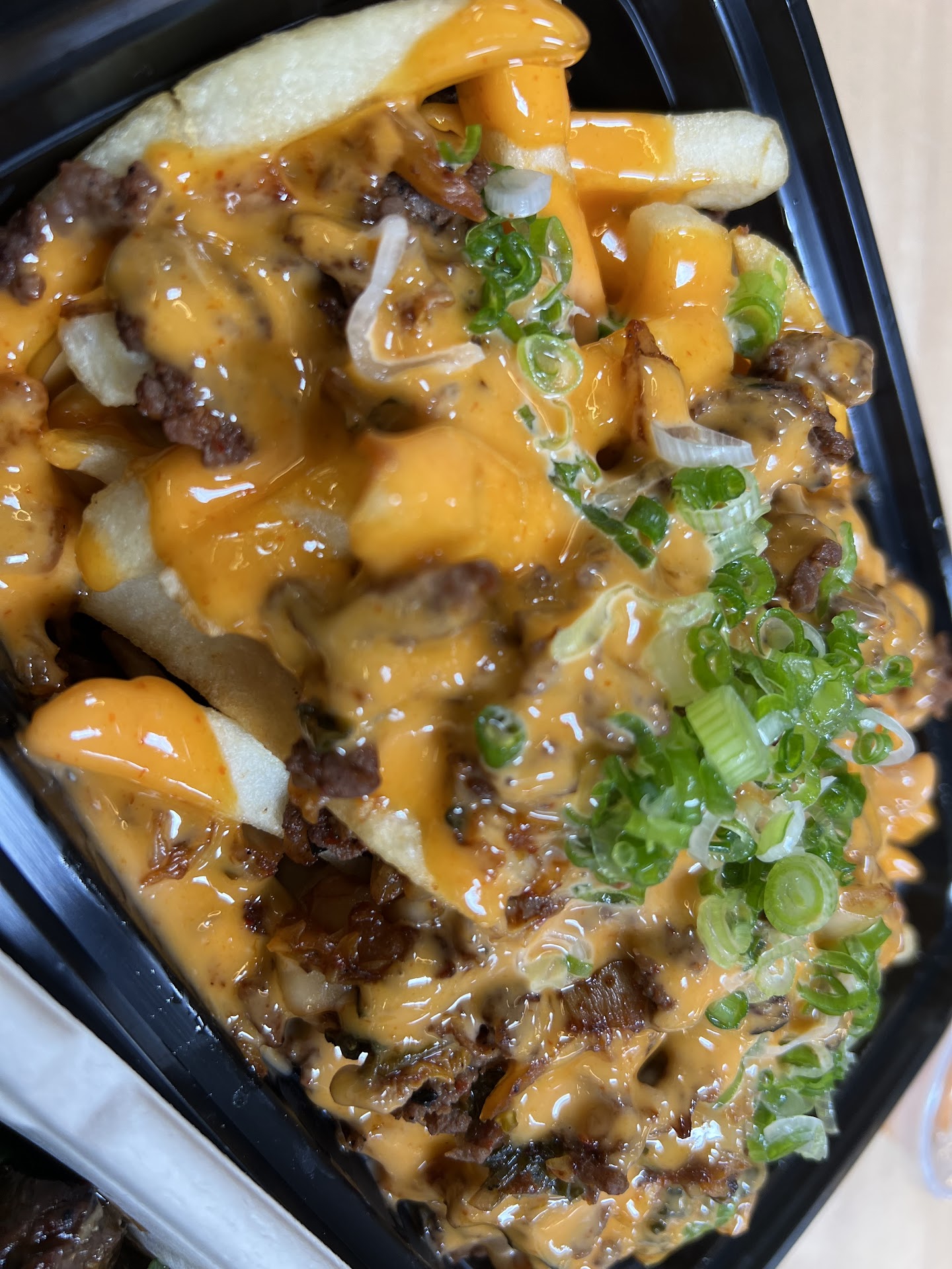 Food We decided to try their Bulgogi Fries. It was pretty good, and decent portion, and they give you an extra siracha mayo like sauce with it. It is packed with flavor but for $16, not sure if I would order again. You could go to another one of the food places and get full rice or noodle dish.