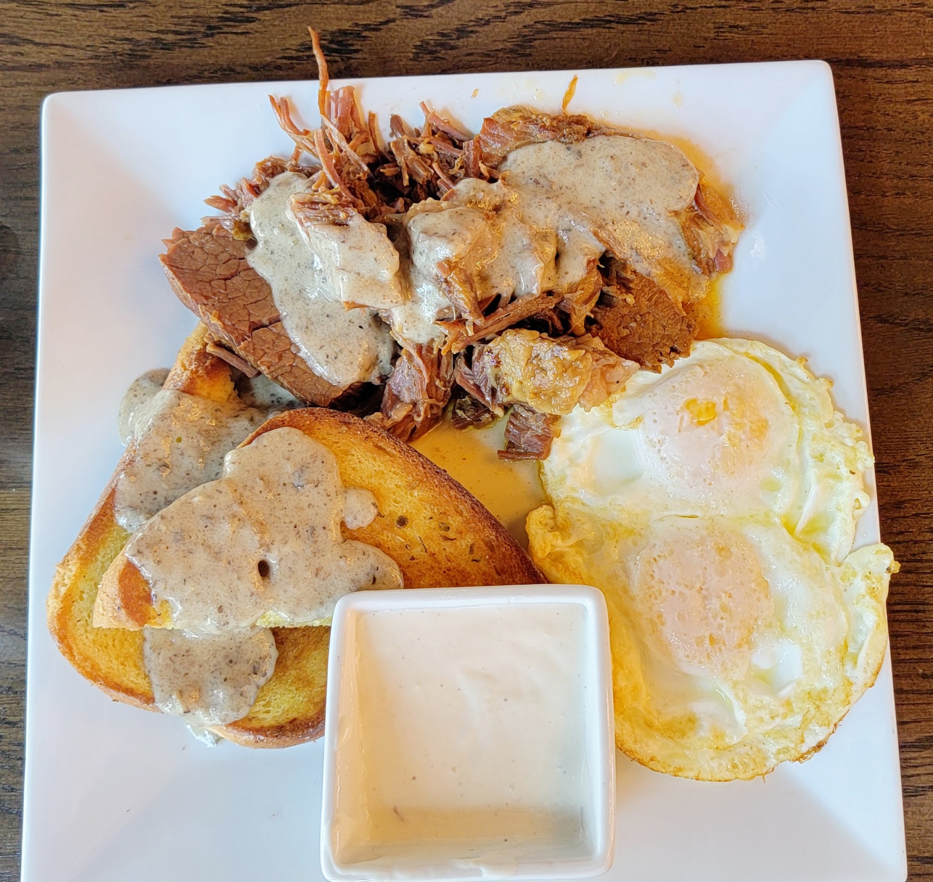 Read moreMy family and I had lunch here today. The parking is easy. It's in a new shopping center, everything is fresh and clean. There are TVs (a bit on the loud side, which is the reason for 4 stars for Atmosphere, but that's a personal quirk of mine), a wide variety of beverages, and everything we ate was perfect. We had the pretzel bites (which we devoured too quickly to get a picture). They were fresh, crispy on the outside, soft on the inside, and just divine. I had the brisket & eggs from the weekend brunch menu. The brisket was smokey, but not overly so. Moist. Delicious. It came with Texas toast and was served with a mushroom gravy. I requested a side of their delicious horseradish, which just took it over the top. Others in my party had the Buffalo shrimp "small plate", which came with a ton of rice and four of the largest shrimp I've seen outside of a Vegas buffet; four Angus sliders, which were so good he talked about them all the way home; and the garlic chicken & veggies. I snagged a couple of the veggies: they were fresh and crisp. We will definitely be returning.