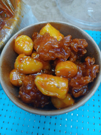 The chicken sandwich was a large portion with sliced cabbage in a white garlic sauce. My brother chose it and said that the dressing was a sweet mayo sauce and did not taste the garlic in it. The fries were good and crispy. I got the small cup of gangjung which is boneless chicken in an sweet and kinda spicy sauce with small pieces of fried tteok (rice cakes). I do like their cheese balls, it's very chewy with melted mozzaralla cheese. It's slightly sweet from the chewy dough they use. I do wish they had sotteok sotteok or tteokkochi with fried chicken.