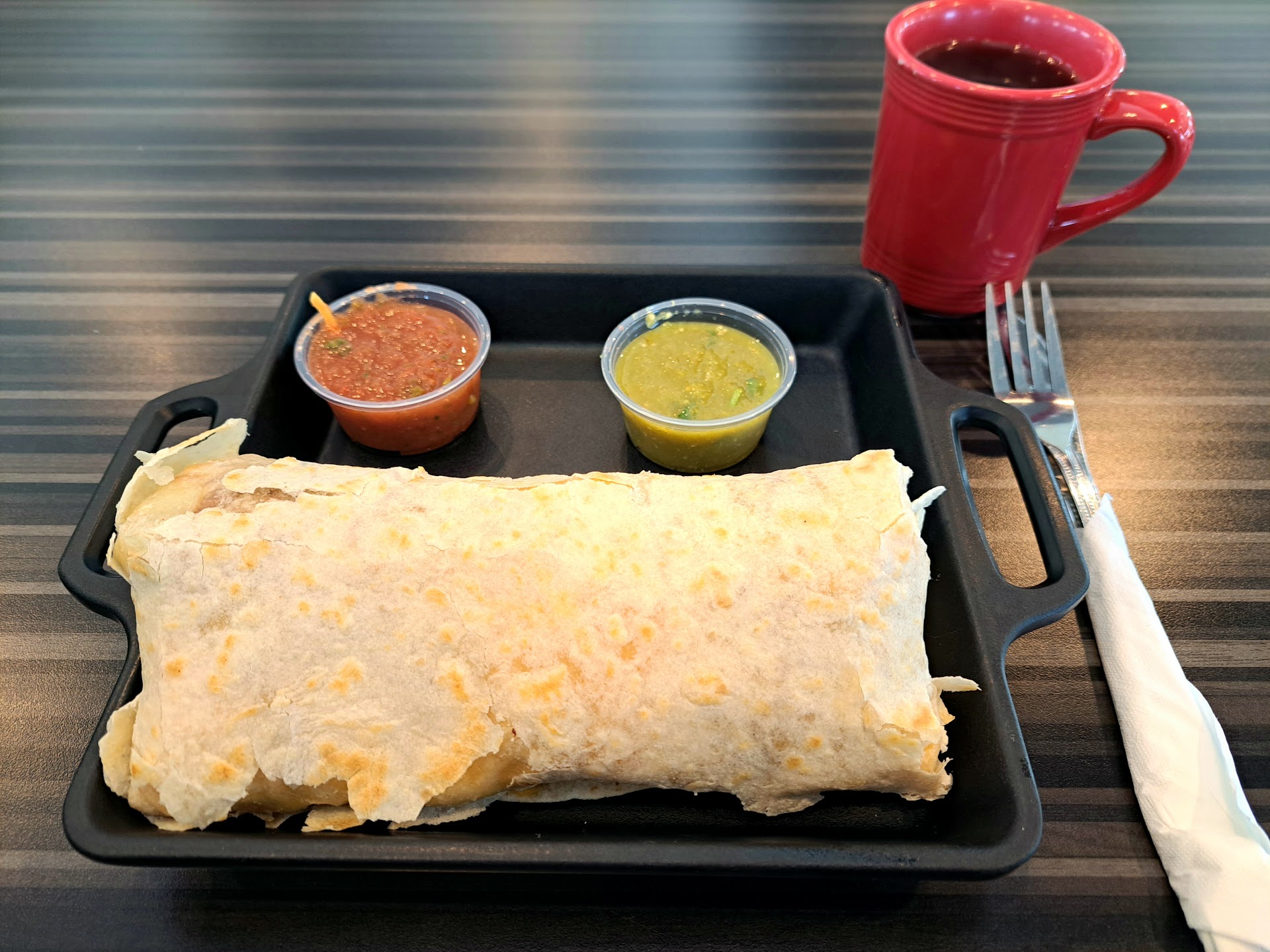 I ordered the same Egg Burrito and Regular Coffee It is served in a square skillet with Green and Red salsa This location has both salsas At first glance the tortilla was very dry However, I decided to try it Despite its appearance the Burrito was quite good as well as the salsas Both were mild and fresh