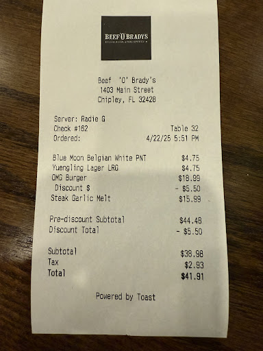 Shortly after, we were greeted by a very friendly young server named Radie (Ray-Dee). Radie was professional, helpful, and clear spoken. We quickly placed our beer order and studied the vast, multi-page menu. With so many pages, it was difficult to decide what we even felt like eating. I decided on either a burger pizza would be my choice but leaned towards pizza. Unfortunately, Radie informed me they were out of pizza so that eliminated some of the options. I am not sure how one could be out of pizza’s but assured Radie it was okay and I would have the O’Brady burger with fries which I chose for the lower calories as most options exceeded my daily calorie intake. My bride ordered the steak garlic melt.