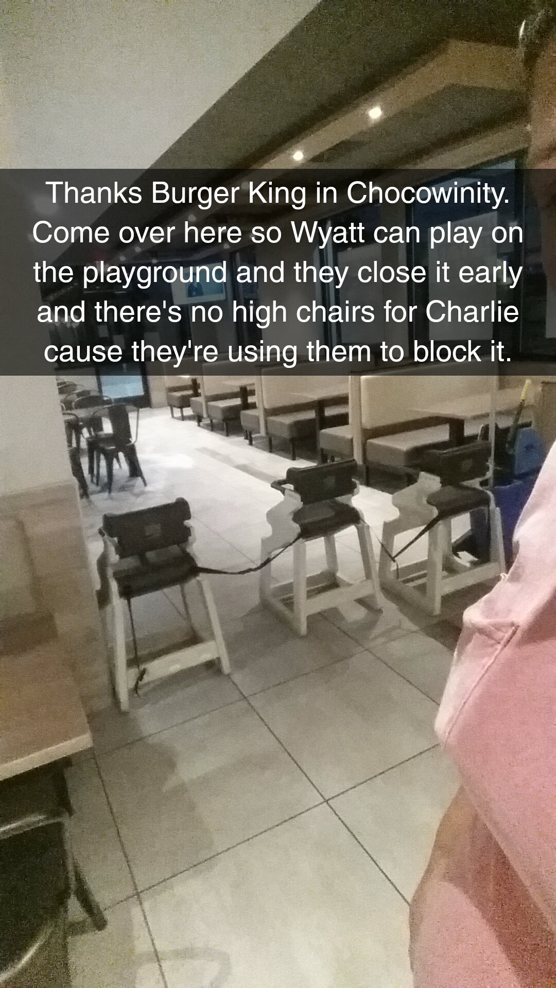 I just would like to say every one even myself have bad days/nights. The Dance recital for CPS was at 6 pm till 7. Guess where everyone went after? Bojangles and Burger King. We chose BK because of the play ground. Wich is closed to the public by the way. Well the young lady that worked in BK s children were playing inside the play area. Well explain how you explain to a 3 yr old that she can't play inside the play area,just the cashier s kids could play. Her tiny little hand got shut in the play area door and my daughter ran over and opened it off of her hand. The cashier had to go attend to her little one. It left people in line with no one up front to fill orders. And I am not bashing a working mother at all. I have been left with having to take my girls to work with me before. It's just the fact that if no public kids can play then no one should be allowed to play. She came back out and worked the line. She was really sweet and thanked my daughter for helping her little one. But if there is anything events at one of the schools going on they should be on top of that. Schedule two workers during that time. They were slammed by the amount of people stopping to grab food before going home. I will say this again. Everyone can have bad nights. Burger King please reopen your play area. Kids love it. If not that door should be properly locked and a sign displayed not open...