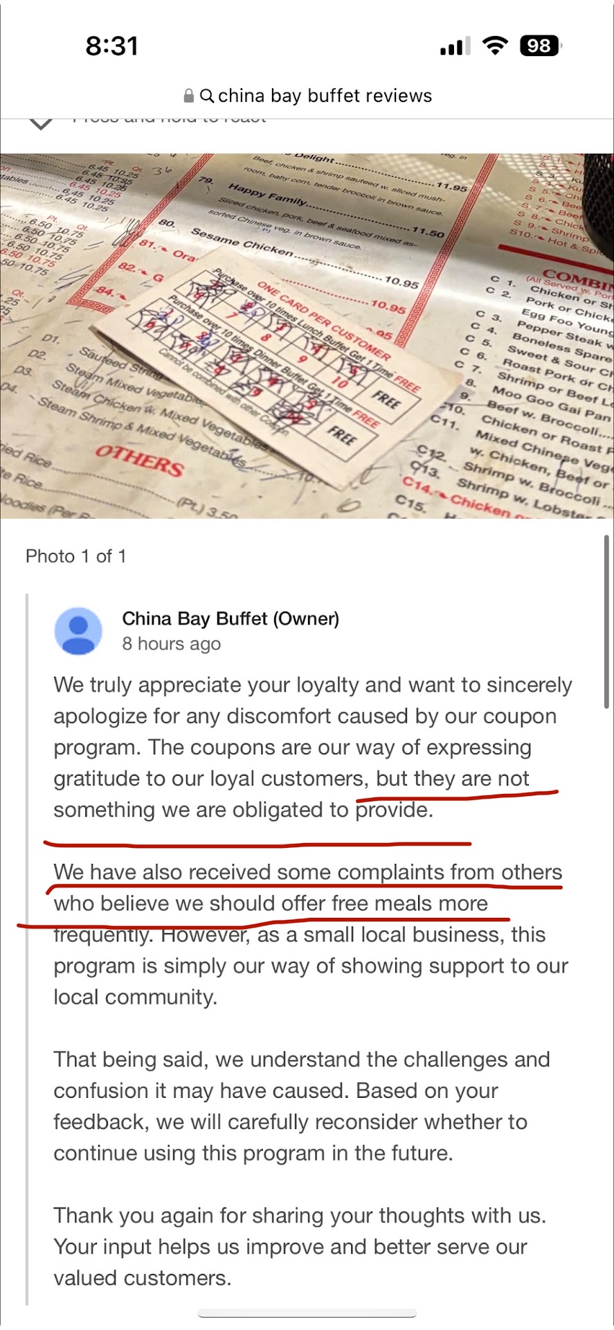 Read moreSo my wife made a post about how often we eat at this restaurant, and how they didn’t honor our buffet card. They responded and said we have had these problems in the past, but we are not obligated to run these coupons. No YOU'RE NOT OBLIGATED TO RUN THE COUPONS, BUT IF YOU DO THE PROGRAM, YOU'RE OBLIGATED TO HONOR THEM! Ok you guys acknowledge the issue, but where is the solution? My mother paid $18 for a plate she had free, due to her rewards. The three girls are saying that the signature doesn’t match the man who was not present. How convenient. The food is great but last night really was ridiculous. If y'all can’t recognize your own signature and you CHEAT LOYAL CUSTOMERS OUT OF THEIR FREE MEAL, DONT OFFER IT. I would suggest using a stamp method, that only you have so you don’t accuse people of forging signatures. How do you plan on taking care of us after we give you great business? My mother deserves a free meal. We have had multiple Birthday celebrations and gatherings at this restaurant. Looks like we need to shop at a place that offers REAL CUSTOMER LOYALTY REWARDS!! Get your...