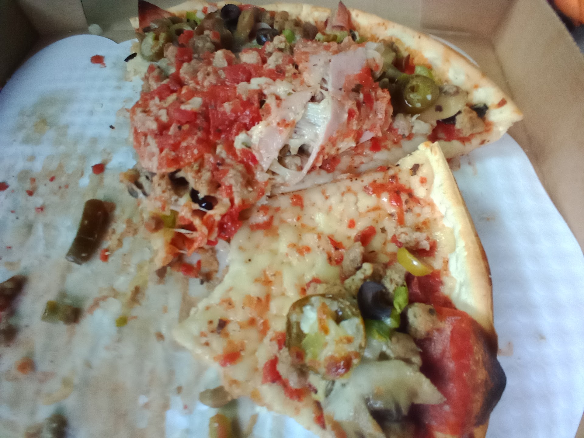 First impression. I've been wanting to try this place for quite a while. So I had the opportunity to call in a pizza order. I ordered a medium stampede with thin crust (it's a super supreme with lots of stuff on it) I also ordered six spicy wings. Once I had my order, I went next door to Sonic to get a drink. I opened the wings up and they were soggy! I knew right away they would be, because they had burned places where they set on the pan in the oven. Also, apparently when you order spicy wings they think you mean barbecue wings! Oh well, at least I have the pizza. I expect when I order a thin crust pizza for the crust to be somewhat crispy at least. This one was not. Floppy pizza crust! Plus the topping sled right off. I really think it could have spent another 2 minutes in the oven. Maybe I shouldn't ordered a pizza with lots of toppings? I travel for work all around the country and get to eat pizza and a lot of places. I was hoping this would be one of those places with over the top Pizza. Honestly, it was just okay. The lady at the window was very friendly and even offered to make me some spicy buffalo wings instead of the barbecue. I declined because I guess I should have asked more questions about the wings. I will still try this place again, as they have some good looking sandwich options. Heck, I may even eat...