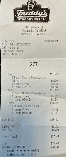 Read moreEvery time I go there I get the absolute best customer service from any business in town!! From all the other hundreds of food vendors to all the retail stores, government agencies, car dealerships, even my own bank!! Their the most respectful business I've ever seen. Any small mistake they make, they will go over the top to make sure I'm happy. There has been times where the littlest things like, I didn't get the right custard, the correct size soda I ordered, or if they forgot extra fry sauce, and I've told them it's ok. Sometimes I didn't even bring it to their attention and they caught their mistake, again I've told them it's ok. Yet they give me no choice but to send me off WITH my mistake, and also the correct order. Usually a business will take back an order they messed up, not freddy's! I'll get home and start handing the family the food they wanted, then keep handing them more. Then I get to the bottom of the last bag, and theirs a free meal card or a free custard card. Twice I have gotten both in my bag for absolutely no reason! The first time I called to see if it was a mistake, and the managers let me know they just wanted to show their appreciation of my business with them. I actually just finished my meal from them before I started writing this. Tonight they gave me smaller sodas then i meant to order, it was totally MY FAULT for not saying large. I said regular and told them I meant to order large, and that I was sorry to ask for bigger ones. The window clerk just laughed and said "it's nobody's fault, we'll take care of it" he let me keep the incorrect sodas, and got me the large sodas FOR FREE. When he opened the window to hand me the sodas, he already had a drink carrier for me. I didn't even have to ask. This place has me hooked, I hope they see this and know that their highly valued in my home. I'll keep going back, even if some days I have a terrible experience. A terrible experience is no surprise in the pocatello/chubbuck food industry. I generally have bad luck when we eat out. Buddy's, Applebee's, sumi su, McDonald's, kfc, butterburrs, red lobster, kiwi loco, noodles and company, fuji Japanese steakhouse, Texas roadhouse, popeyes, buffalo wild wings, and a ton other. I have either had a bad experience or average on a good day with these places. NOONE COMPARES TO FREDDY'S FROZEN CUSTARD, NOONE. Absolutely gonna give these guys 5 stars!!...