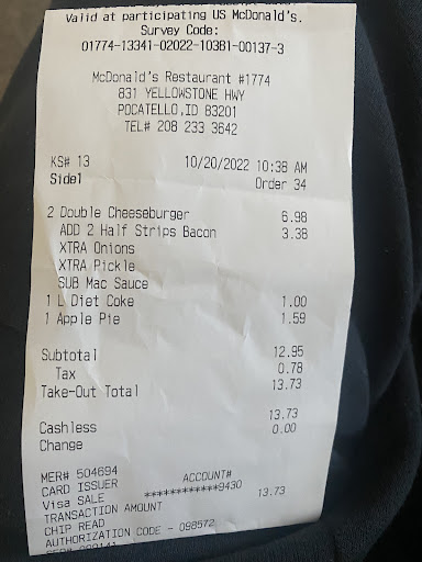 I wanted to share a Kudos to the folks in your drive up window last week. I noticed that the last two times I've been there these last couple weeks, when I goto give the cashier in the drive up my Debit card they are taking steps to make sure I can see the card in their possession at all times. Whether that is by putting the card reader out the window, or always keeping my card up and in view of the window where I can see them run my card at cash register level and at no time is my card being lowered or going out of my sight by turning their back to me. Keep up that good work!! I appreciate it. I work in IT Security. And I heard about a female McD's drive up employee in another State who was taking a long time in the drive through to run a mans card. Several minutes. Turns out she took his card and was copying the numbers from it out of sight... Heard she was making Venmo payments and he received the fraud alerts on the customer's cell phone before he could even leave the parking lot. So thank you to the Poke / Chubbuck McD's here for taking steps to properly handle my debit / credit card when I go through the drive though. Please make this your standard operating procedure going forward in case this isn't formal policy yet. But know, many of us are watching for how your employees are handing our PCI information and watching for anything resembling credit card "skimming" behavior from your staff. You guys at this McD's are doing great so far!! Please keep up the great work and pass along the message to the rest of the staff. After all, you do work just a few short blocks from the FBI... (couldn't hurt to remind the staff of this fact in case anyone has any bad ideas) lol On the downside, your team did forgot to put two apple pies we ordered and paid for in our drive through order last Saturday and didn't have time to go back around again and wait another 15 mins in line... you had us in the drive up parking spot #1 and you walked our order out to us and walked away before we could inform you... so we'll come see you tomorrow about that. Otherwise, good job...