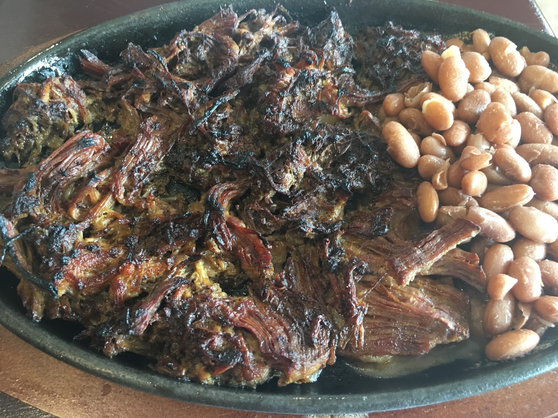 On my visit here, I ordered the "Tatemada de Res," where a substantial amount of dry-roasted beef birria, seasoned and bearing crispy carnitas-like edges, is piled on an oval cast-iron sizzler adjacent to a serving of pinto beans, and accompanied by a concentrated beef broth served on the side in a cup. This dish arrives at the table with fresh corn tortillas, which inspires a DIY taco assembly process that leverages the lime, raw onions, cilantro, and hot sauce delivered to each table before the rest of the food comes out. The shredded beef is well-browned at the expense of being slightly over-done and dry. However, with the accompaniments provided, particularly the broth, the meat transforms into a nice tortilla filling that is characterized by its strong, concentrated beefy presence.