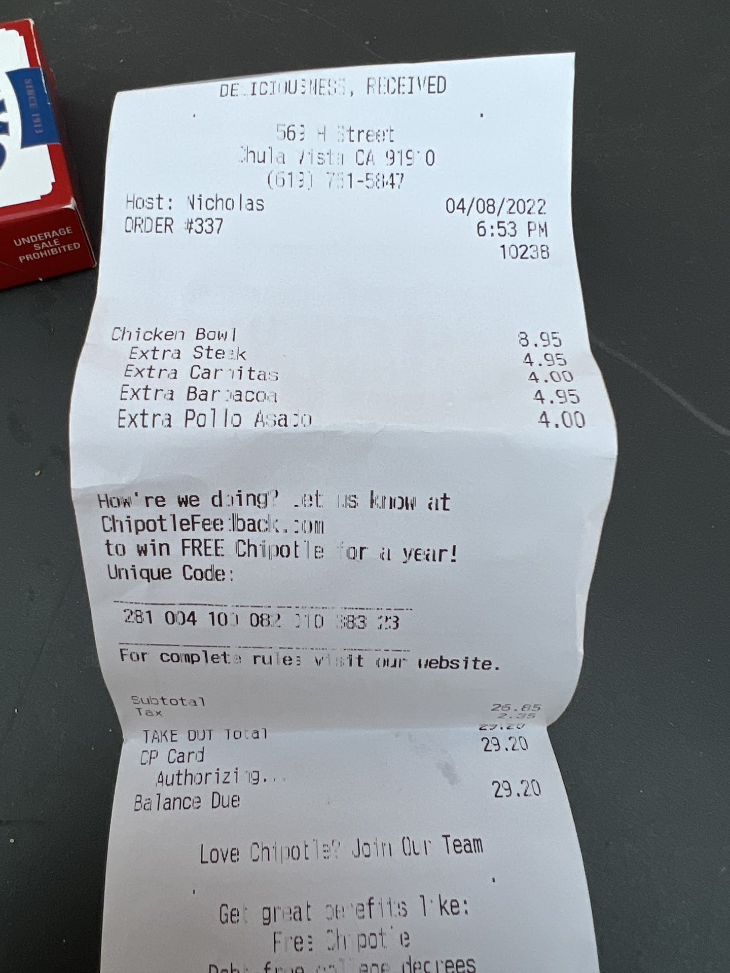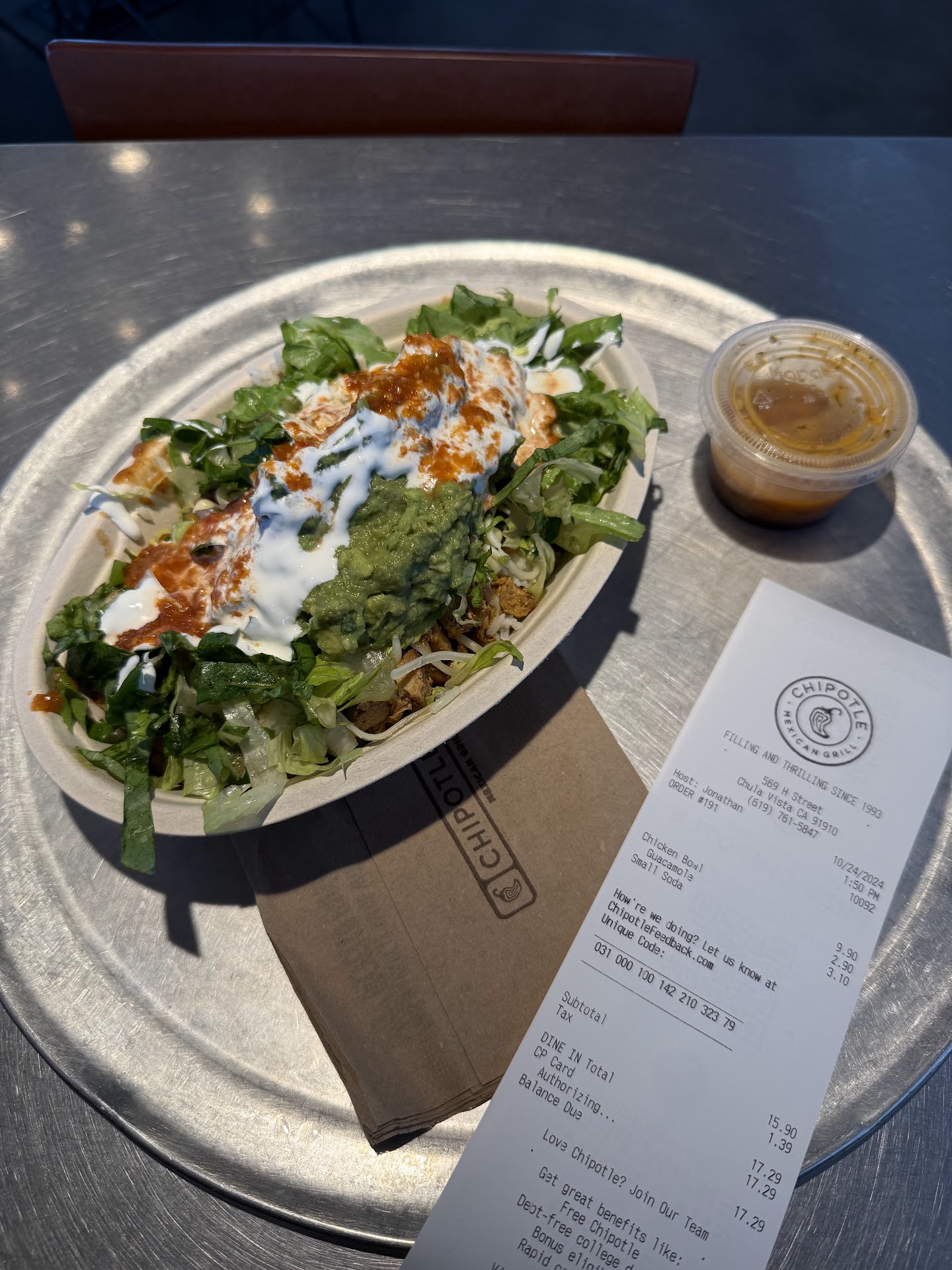 Read moreAs in any chipotle you have to be mindful of the way you order your bowl if you want to recieve optimal results. I got for myself a bowl with white rice (Make sure they do 2 scoops), a little pinto beans, half chicken half steak (make sure half and half, not double protein unless ur feeling it), and then I topped it off with, corn, cheese, lettuce, guacamole (don’t be like me, and make them top your bowl with it instead of in the middle so they don’t feel as confortable skimping), and finally sour cream on top. They honestly did good with portions and I only had to ask for a bit extra sour cream just to fit my liking, but they’re generous and accommodating. I also put red sauce on top of mine, but as I found out later I’d recommend having it as a side instead for convenience. I also tried the vinaigrette, but honestly it’s not that good and throws the flavor off. The tiktok mukbangers made it look so good, but it’s not very flavrlful however the flavor that peaks through isn’t particularly yummy. It’s vinaigrette at the end of the day, heavyyy on that vinegar part. I’d say just get sauce and your boo tbh. I also highly recommend getting a tortilla on the side. I didn’t even know that was a possibility and for 50 cents it really does elevate the meal significantly. For drink, I did pay for one although they have paper water cups so idk who would stop me if I wanted to break the rules and drink soda from it, but I’m not thaat brokey so I’ll be mindful. I don’t usually get chipotle, and when I have in the past it hasn’t been great, but I liked the bowl I had today and I’ll come again when my check hits good. 17 dlls is pricy, and I can’t even imagine what it’d be like if I wanted double meat but I know it would be fire. Hopefully they don’t do me dirty here in the future, but for today...