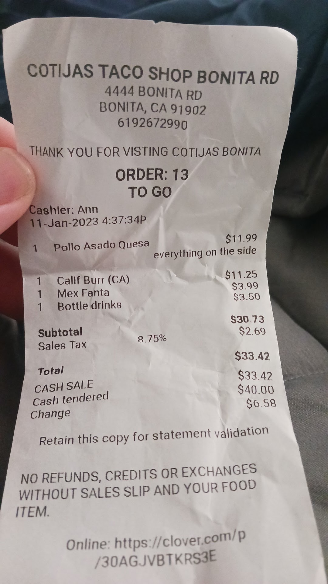 Read moreFood is good but service is awful. I placed an online order for the shrimp with carne asada burrito and specifically put no chipotle sauce. I go to pick it up, and the man said Ivanna had already picked it up. I said what do you mean? Obviously I was upset because it took me at least 15 minutes to get there and for him to say that. He looked through all the orders in the back and gave me a burrito that was supposed to be “mine” which didn’t even have my name on it. Cooks were mad because it had the sauce. I just took it because it was not the cooks fault it was the cashiers fault at the front who clearly doesn’t read the specifics customers make. The cashier didn’t do anything to compensate the time that we were there during the time he was figuring out what happened. I won’t make an online...