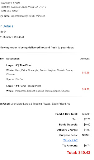I needed 3 pizzas for a kid’s birthday party in school. Since most of the pizza places nearby open at 11 and I needed them before, my husband suggested domino’s pizza in downtown Chula Vista. I usually check on yelp but it was late and I placed an order online for next day pick up at 10:40am. This place is still “contactless” which means the staff talk to customers through a very little opening placed at your belly height…very convenient uh! Staff is rude, do not come to the window to talk to customers and seem as they are giving you a favor selling you some junk pizza. Long story short: domino’s app (that I had to download to order and track my order) showed that my 3 pizzas were ready at 10:35am. I had to knock at the door and window for at least 3 minutes to get my pizzas at 10:55am. 4 people inside the store and nobody could give me an update on the status of my order for quite some time. In the meantime another customer arrived to place an order and the staff rudely told them to call as they couldn’t get an order in person. Just as a reminder it’s not gourmet pizza, it’s a fast food chain! The other customer left and was reasonably furious! While waiting and knocking, since I was not getting anyone, I tried to call the store (remember I was standing in front of their door). The phone number sounded disconnected! So tell me how customers can place an order! Anyway this is bad karma for me: as an Italian citizen I should have known better and avoid Domino’s....