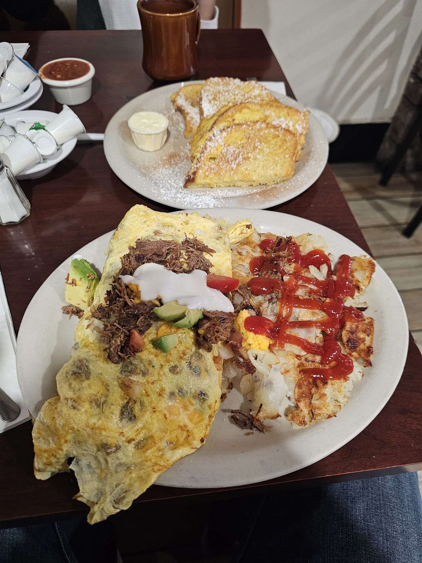 Read moreBreakfast time! Get here early and wait patiently. Don't bring a bad vibe with you. The restaurant is on the smaller side, so you will be waiting outside, on the sidewalk, until called. There are no benches, be prepared to stand. This location is on the smaller side but the service is courteous and quick. They have been here since 1964 and it shows. From the decor to the bathrooms (Gender neutral) to the whole layout, but the food is delicious. My pancakes were fluffy and cooked to perfection. The butter and syrup, pure deliciousness to top them off. My homestyle potatoes crispy on the outside and cooked just right in the middle. I didn't care for the Garden scramble eggs with sausage, don't get me wrong, there was a lot of sausage mixed into the eggs however something about the texture didn't sit quite right with me. My friend Javier had his usual Shredded beef omelet with avocado. His was amazing as usual and he did comment that the pancakes were, "bomb". On a side note, next time we're going to try the Asada with chilaquiles plate, a gal at the table next to us ordered it and it looked amazing. Coffee was great, service was great, check this place out if you're in the area. Don't forget to tip your server, they are working really hard to make your visit a good one. This place is a small piece of history from a bygone era. Definitely dated but just like anyone else born in the 60's we take a licking and keep on ticking. Have a great one. Bon appetit! 11/26/23 Breakfast Corn Beef Hash omelette with potatoes and pancakes. Pancakes w/butter and syrup ALWAYS a great choice. The corn beef hash was different than what I'm used to. The flavor was good however the texture was not to my liking. It was more like sandwich meat, not unlike a Rueben, sliced or chopped up and put into an omelette. It was good nonetheless. Portions were big. I couldn't remember what I wanted to try until I reread this post. Next time I'm having the Asada w/chilaquiles plate. Javier had his usual Shredded Beef Omelette with 1/2 an avocado on top. Two breakfast with coffee $52.00 ($2.00 credit card surcharge) plus $20.00 tip. Thanks Javier. I got the next one. Great start to...
