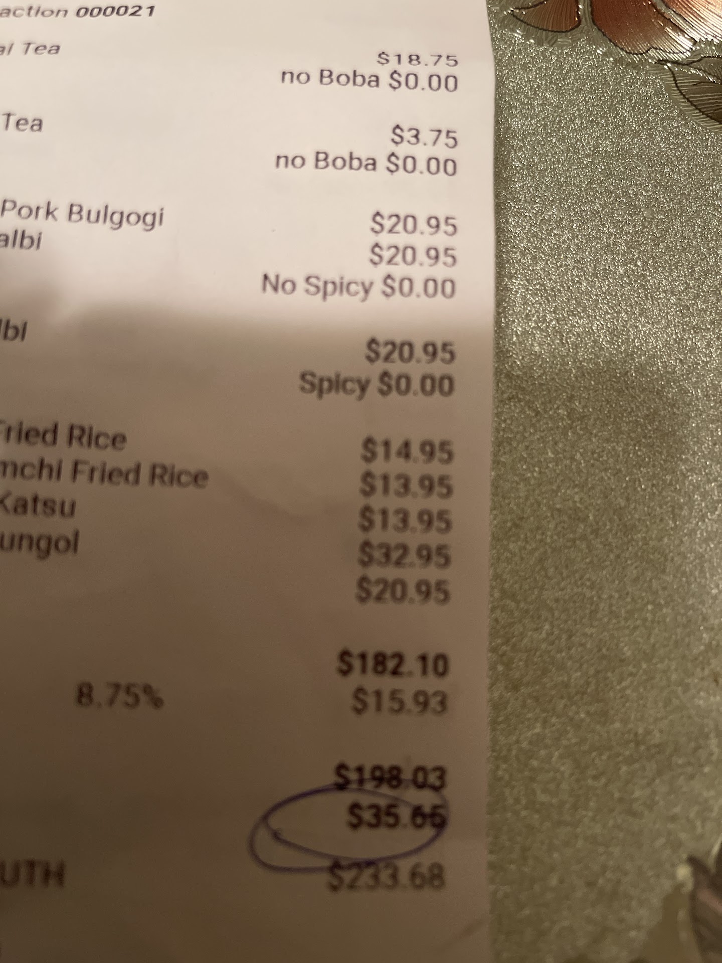 Read moreI wouldn’t lie the food was kinda good but the problem about this places was the service like the food was slow the place was un organize and mostly the paying was the worst I ordered a bolgogi and they haven’t give it yet and when our main waiter told us that what else do you guys have i said we have 2 bolgogi and he came back again and said that what you guys need in between 10-20 mins the people in our table is almost is almost done with the food and I haven’t got my 2 bolgogi for the the whole table and i just said let ne just have one and make it a take out and they gave it to me but they said that it was 2 in the box the main manager when i start paying but charge me with an extra one and also they said that they have to charge 12% for 4 and up amount of people and also the 12% was not 12% it was more 25% just dont go to this place the workers was slow and kinda not use to the busy place and...