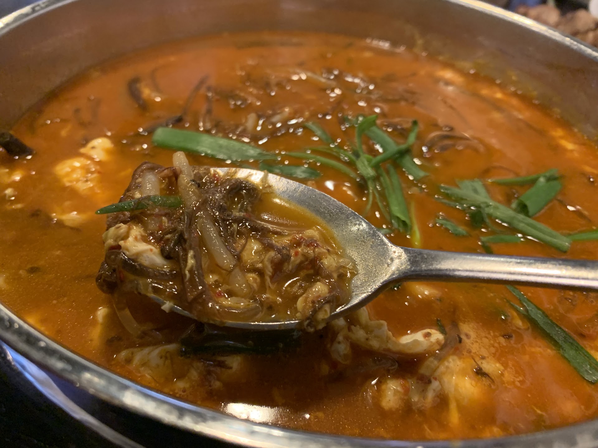 Whenever I'm feeling homesick for my mom's tofu soup (usually when I have a bad cold), this is where I go for comfort! The spicyness of the gochujang in the Beef Soon Tofu soup or Kimchi Chigae soup clears me right up! The Beef Tofu soup is very tastily prepared, it comes with extra soft tofu, beef, mushrooms, zucchini, and very very hot soup (just about boiling) and the side dishes are excellent, very tangy and generous portions. The Kimchi Chigae comes with scallions and jalapenos for even more kick. For my American and Mexican friends, I normally order something different. The Bulgogi BBQ meat never fails, and Kimchi Pajun (Korean pancake with seafood and kimchi) I always tell them is a Korean pizza! If you're not in the mood for soup or a ton of meat and want more veggies, I would get the Dolsot Bibimbap. It includes a fried egg with runny yolk on top of rice with carrots, mushrooms, zucchini, carrots and bean sprouts. I cover the entire thing with lots of Korean hot pepper paste (that's gochujang) and mix it right up. So delicious!...