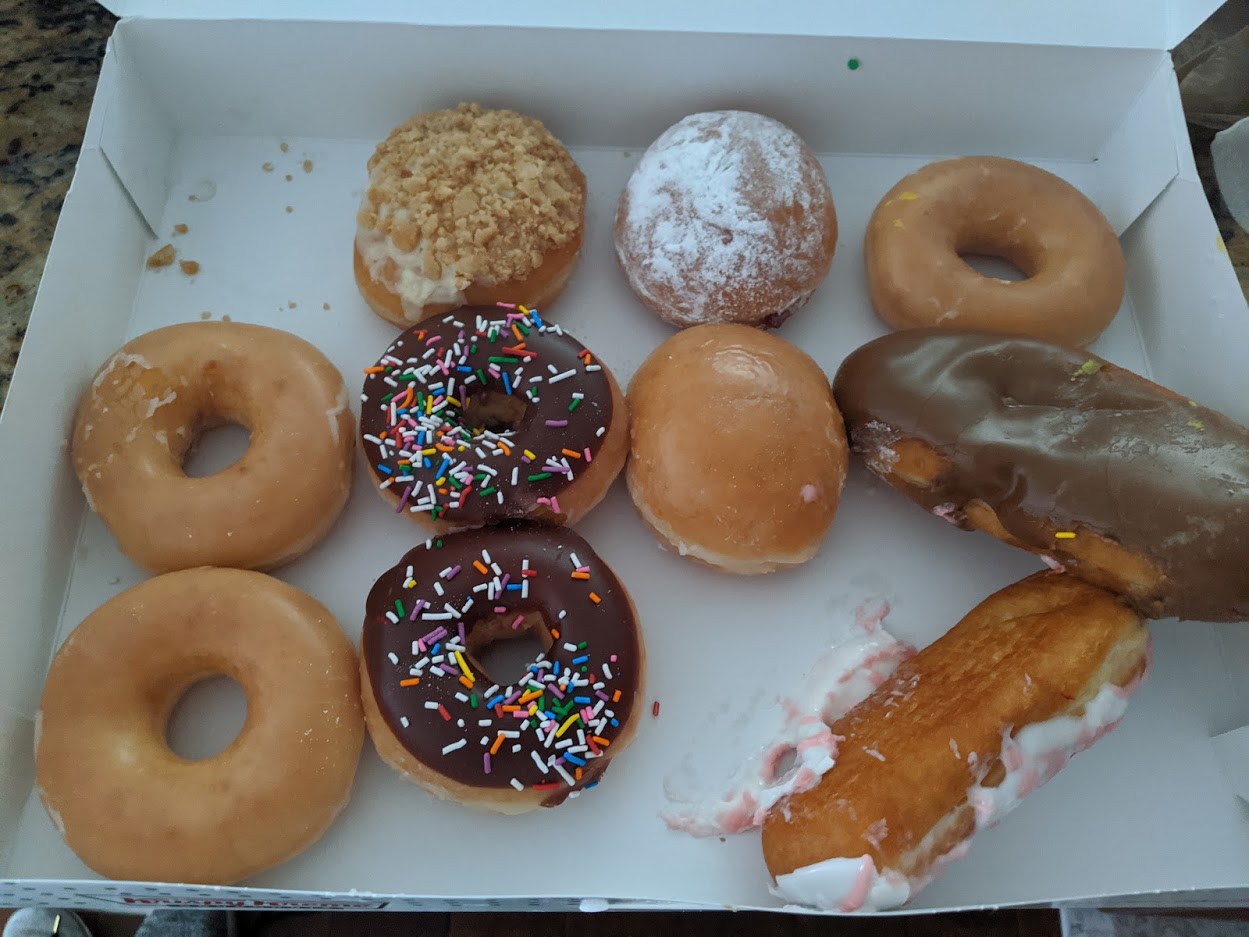 I haven't been in this store in a while, but I believe the quality has gone down since the pandemic. I ordered an assorted dozen and had to pick and choose from pictures. They didn't even have the original kreme filled glaze donut available and it was only 8:30 a.m.! Although only two customers were allowed in the store at one time, it was loud because the person taking the orders had to verbally tell the workers behind the counter what the order was. And the workers behind the counter tried to take orders from customers as well, which resulted in multiple people raising their voices just to be heard. What was most disappointing was when I finally opened the box and see the sizes of the donuts were significantly smaller than what they used to be. My father, who hasn't had krispy kreme donuts in YEARS, just opened the box and commented on how small they are. Not to mention, my order was wrong (probably because the workers couldn't hear) and you can see from the picture that some of the donuts were just tossed in the box. Granted, the pandemic has affected many businesses. I appreciate the safety precautions they've taken to assure everyone's health and safety, but if i'm paying the same price for a box of donuts that I did prior to the pandemic, I expect the same...