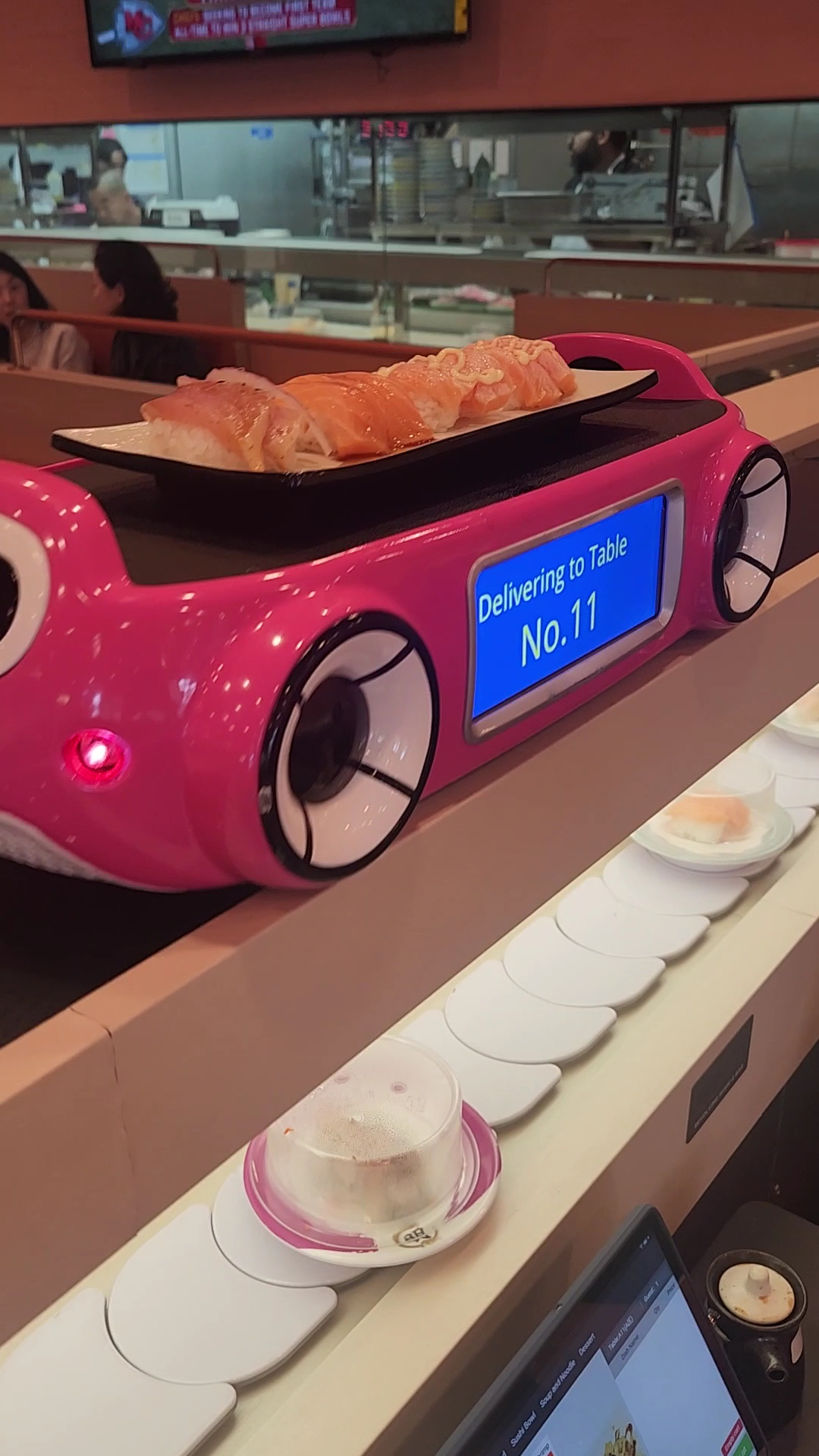 Service: 3/5 just because theyâre new and growing/opening pains can be expected. Arrived at 7pm and got seated under 10 minutes. Servers were friendly/polite and explained how everything was supposed to work. The tablet used for ordering was buggy. Half the pictures were either missing or not loading and a black pop up box kept popping up with what Iâm guessing was Chinese charactersâŚwe had no idea what it said. Placed our tablet order at 7:11pm. Tablet continued to glitch out after placing the order. Our drinks arrived at 7:20pm. We watched two different and larger parties that were seated across from us receive several items they ordered via tablet before our order arrived...they were seated after us. The Bluefin toro nigiri and seared eel with mayo nigiri (4 pieces total) finally arrived at 7:43pm. We decided to pay and leave at 7:55pm without receiving our baked salmon roll. At least it wasnât a hassle to have it removed from our bill. Other things to note: wasabi and ginger Isnât provided at the table, just soy sauce. The server asked if we wanted to buy fresh wasabi or ginger so, Iâm not sure if either of those are included. Also, some of the lids covering the sushi items were of questionable cleanliness. A few covers had sauce residue on the outside while the sushi it was covering did not which lead me to think that the covers are reused without being washed in between.